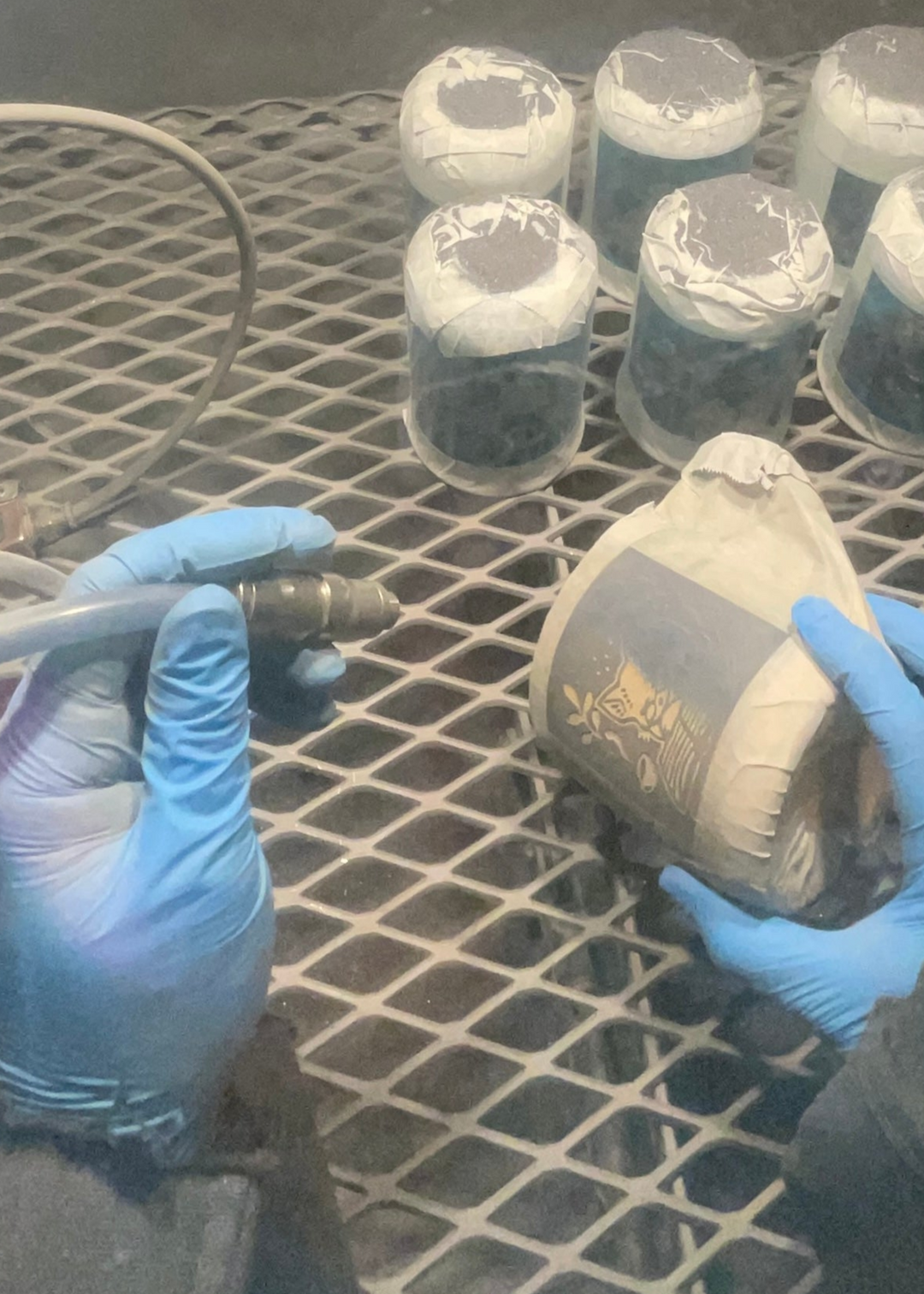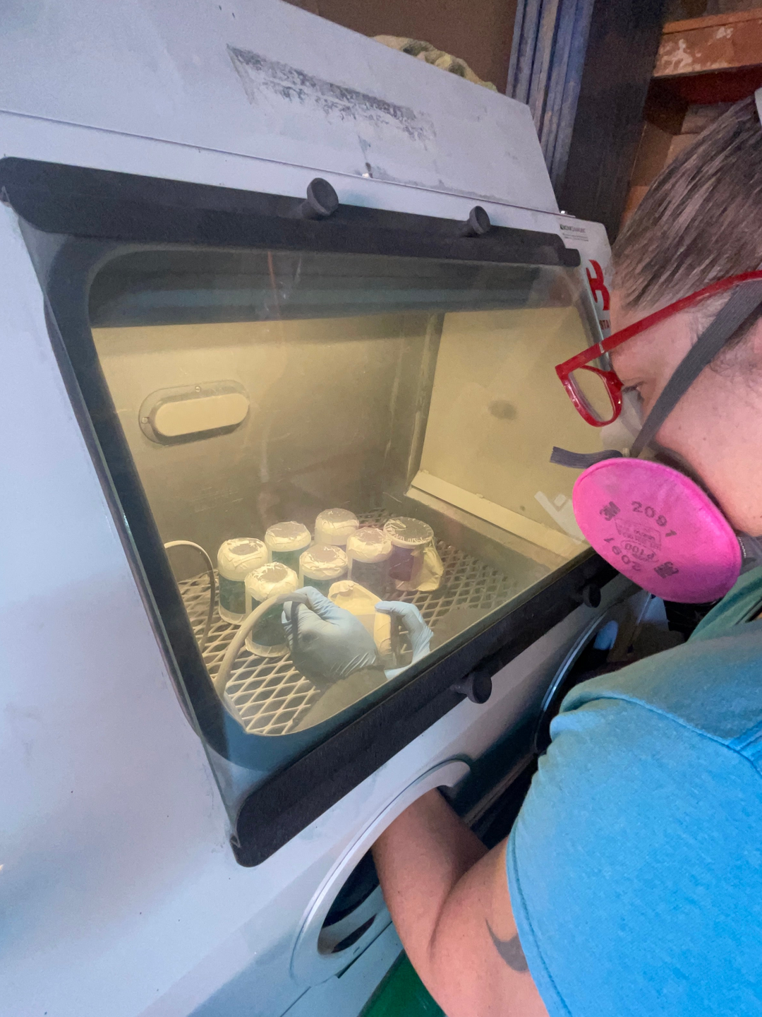 I have a professional sandblasting cabinet, where I safely carve away the surface of each glass or ceramic item using silicon carbide abrasive at about 30-40 psi.