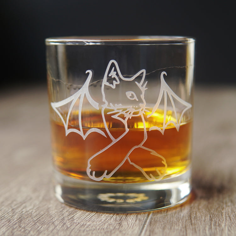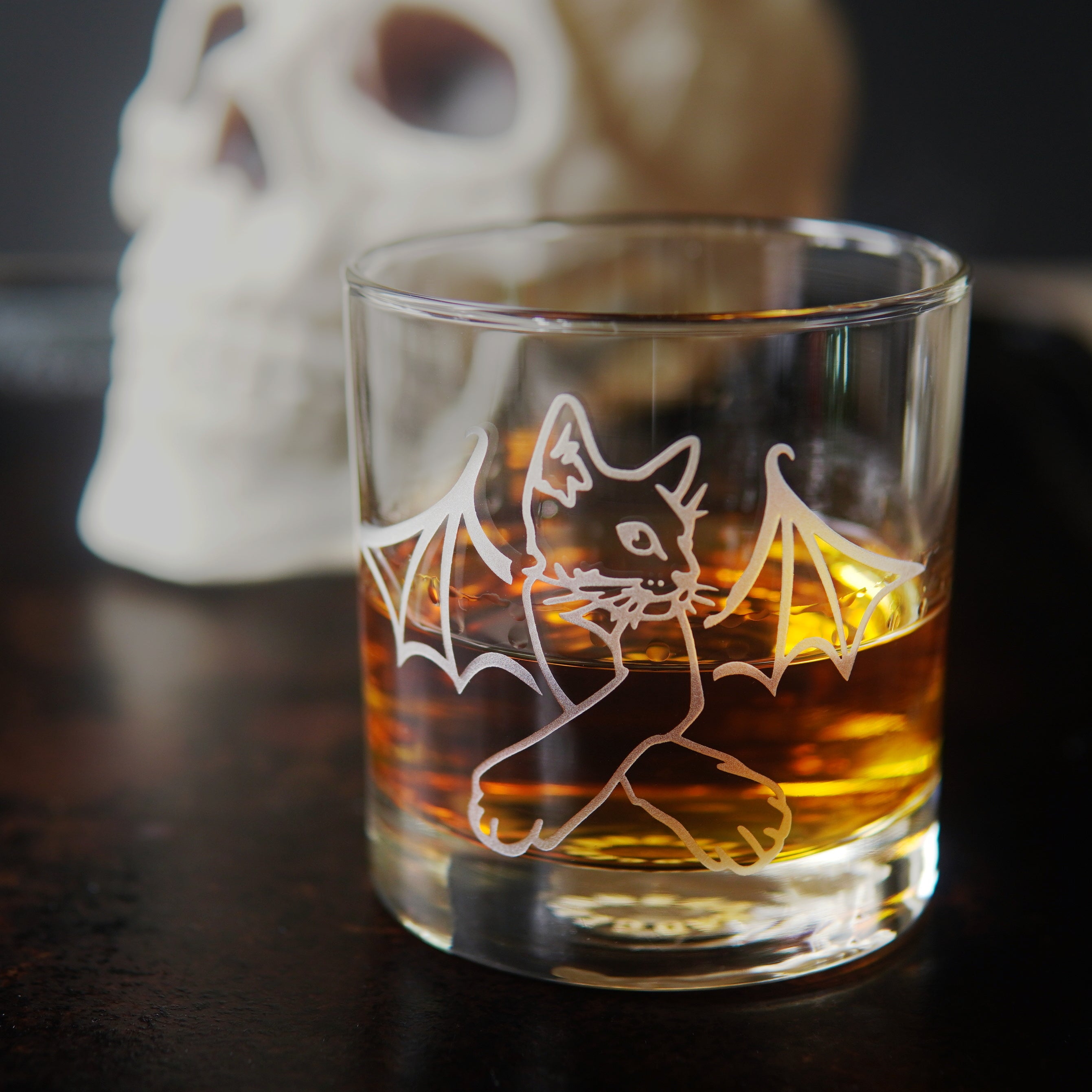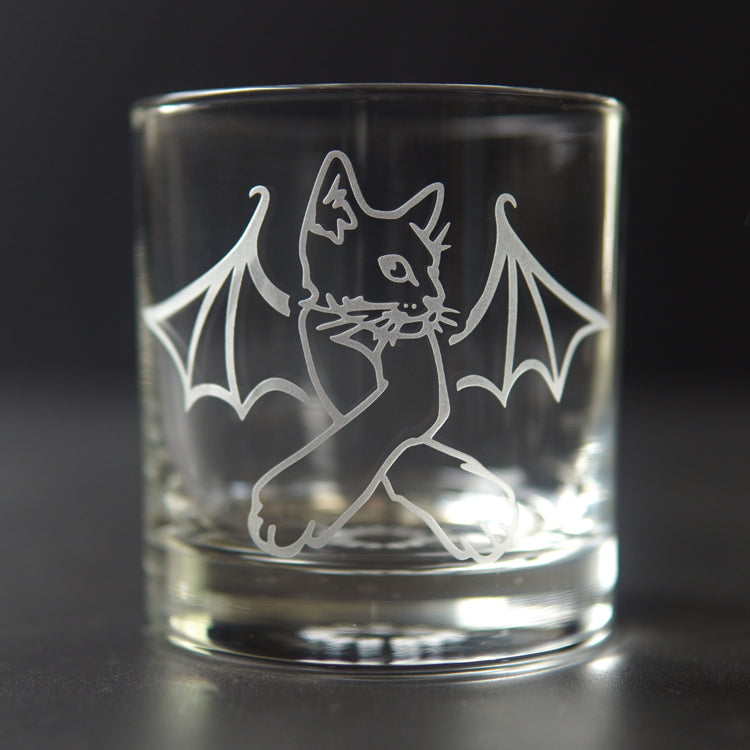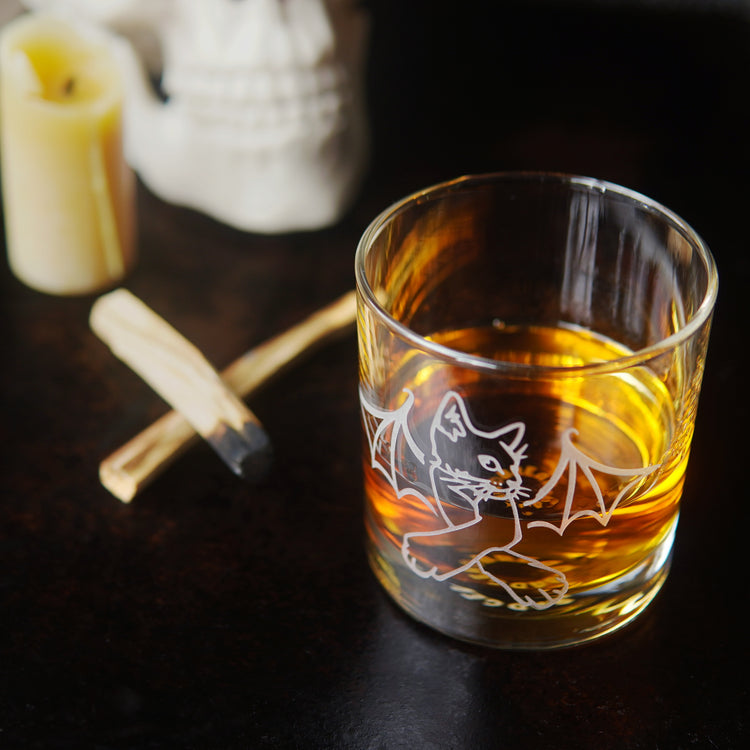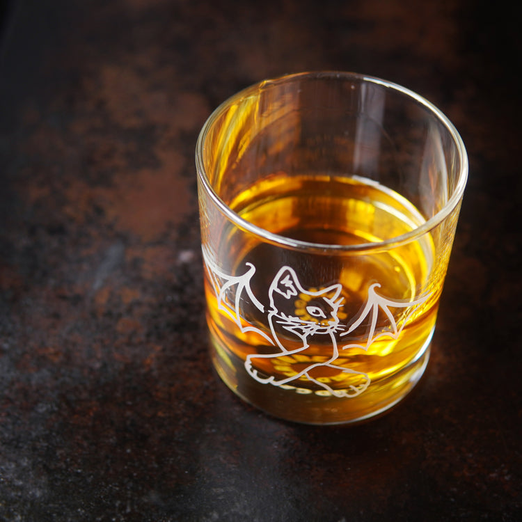 Prepare to join the most adorable court of nightmares with our Cat Bat lowball glass. This etched barware features an adorable vampire cat with bat wings--perfect for adding a touch of spooky cuteness to your Halloween festivities.
