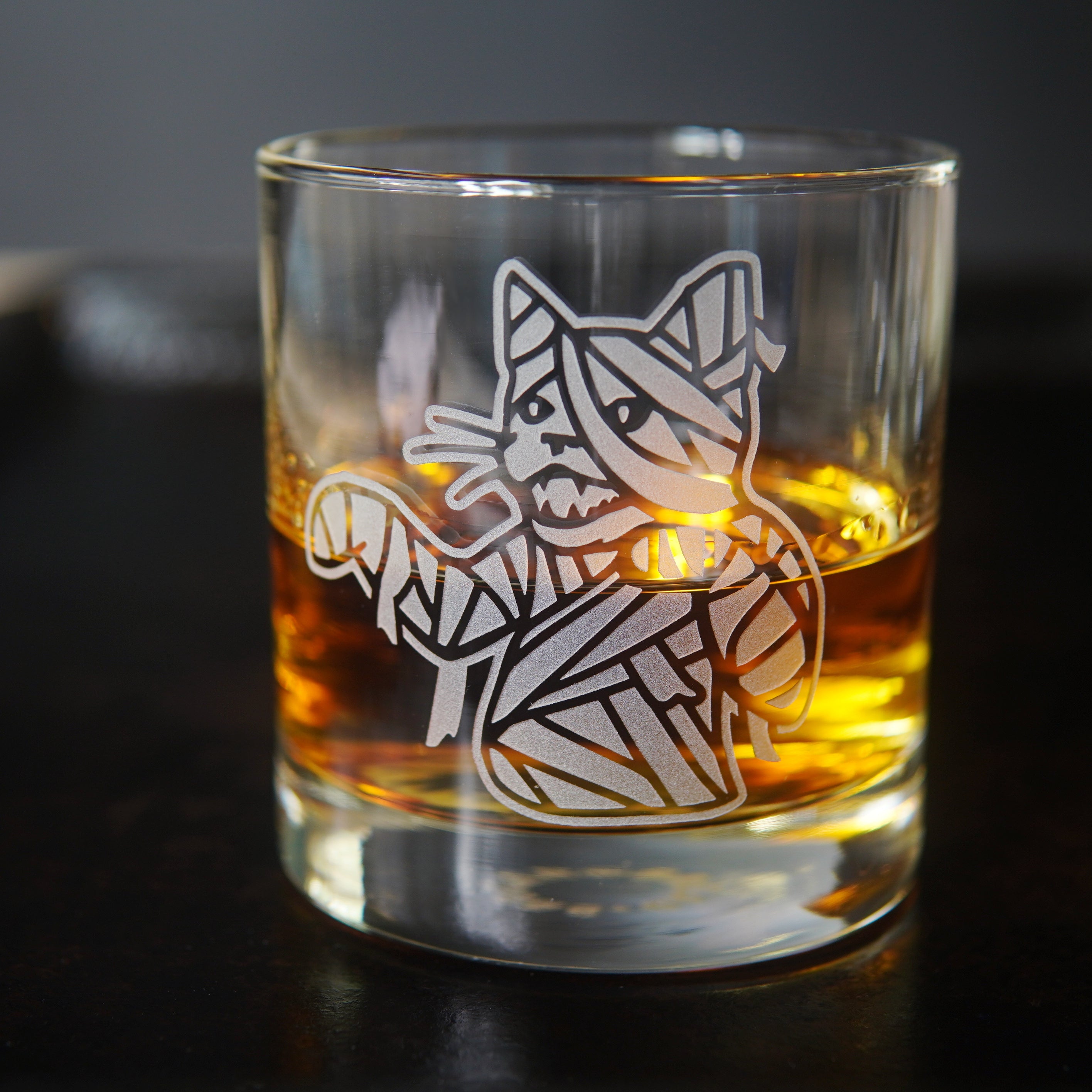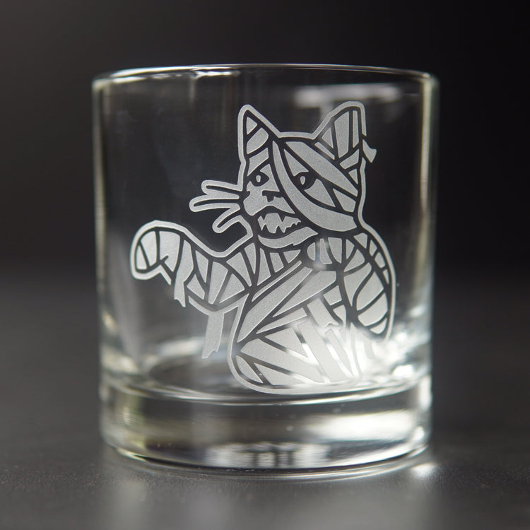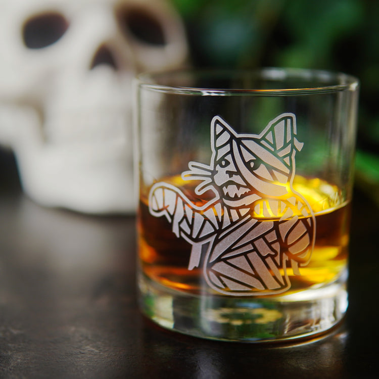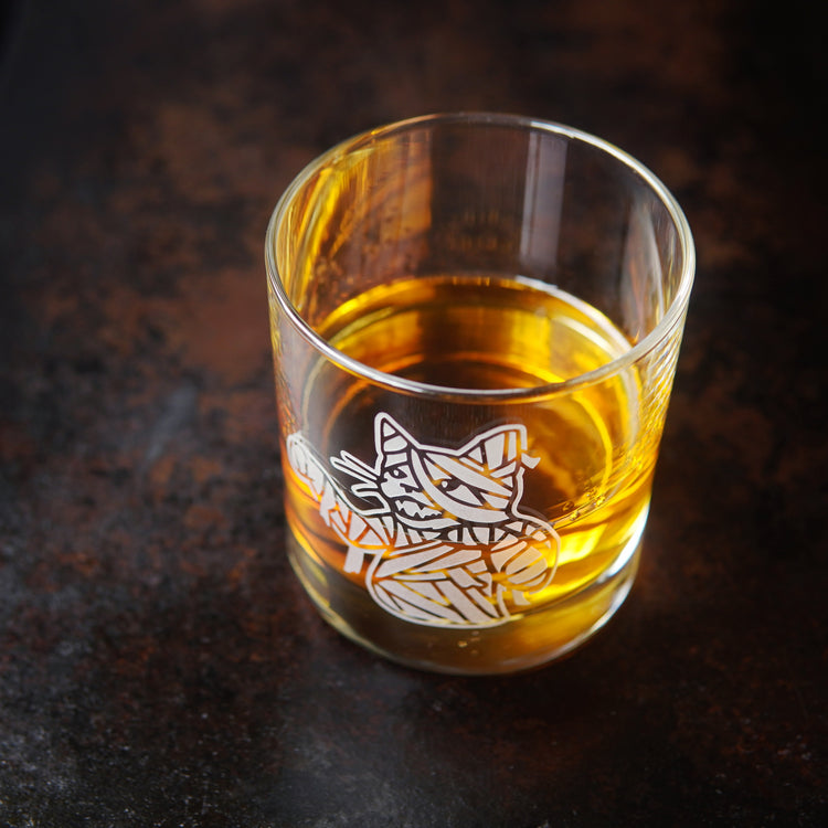 Embrace your spooky style with our Mummy Cat lowball glass! This adorable cocktail glassware is perfect for Halloween or everyday to add a touch of classic horror to your double old fashioned. Warn everyone to avoid the cat mummy's curse by leaving you in peace until you've finished your whiskey.