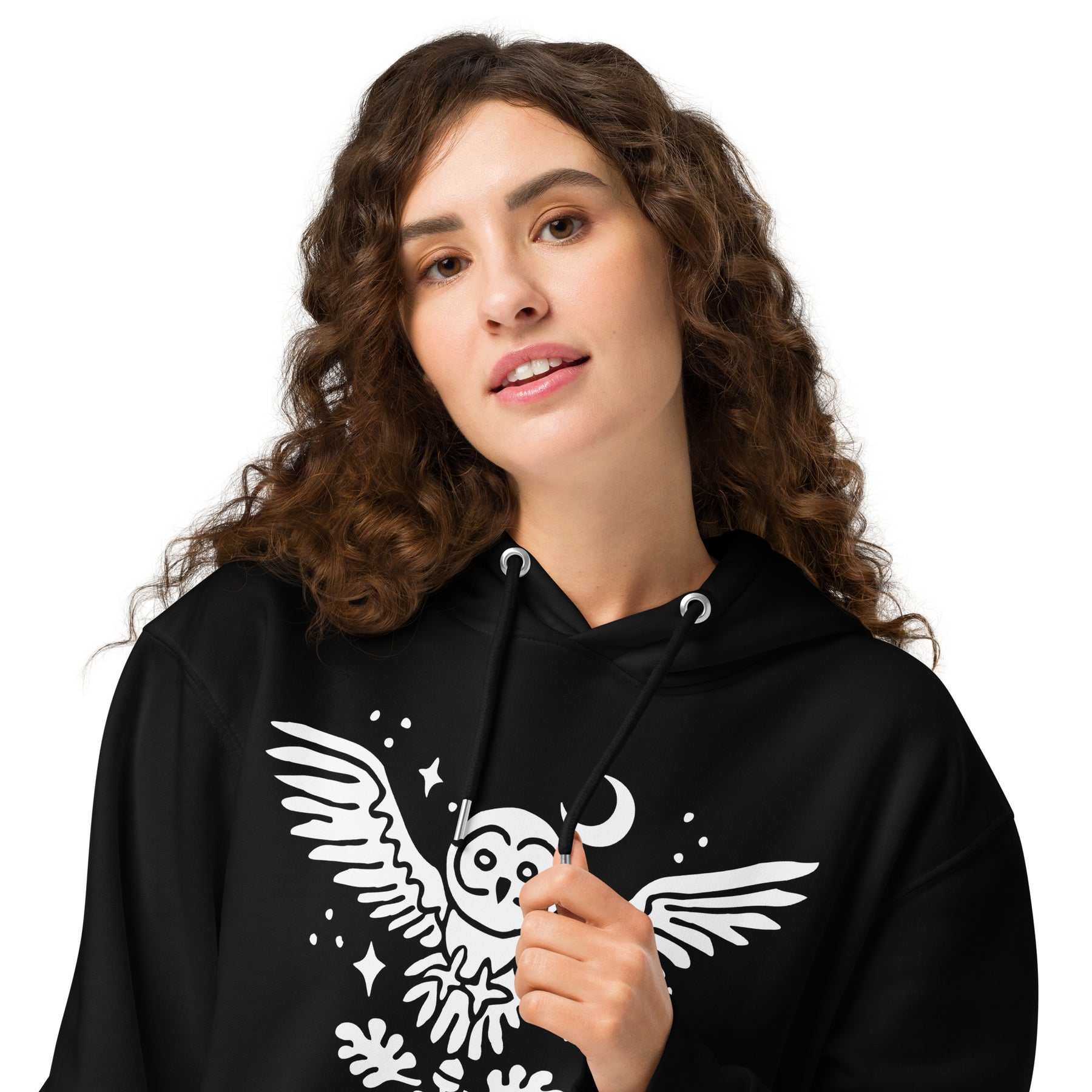 Our owl and oak leaves premium hoodie pullover sweatshirt shows the world your love for these nocturnal birds and their dark forest vibes.