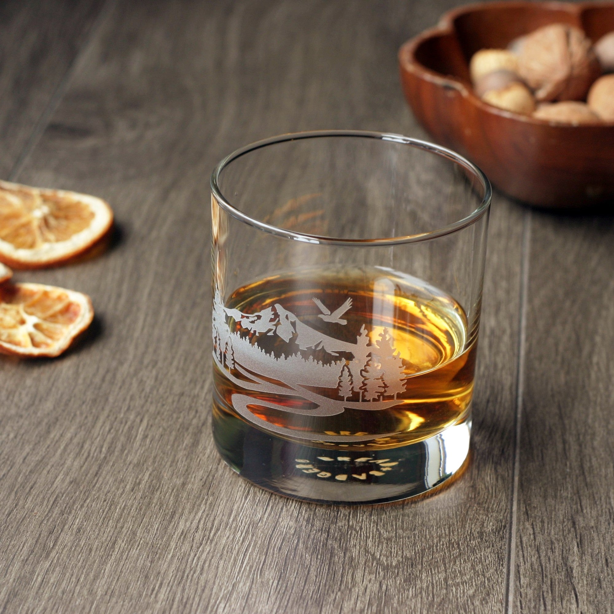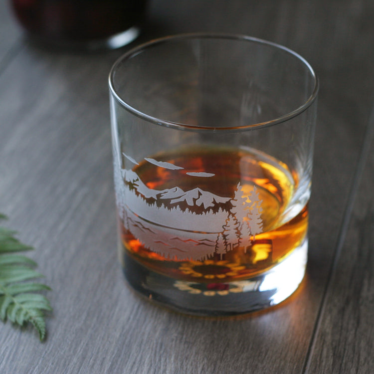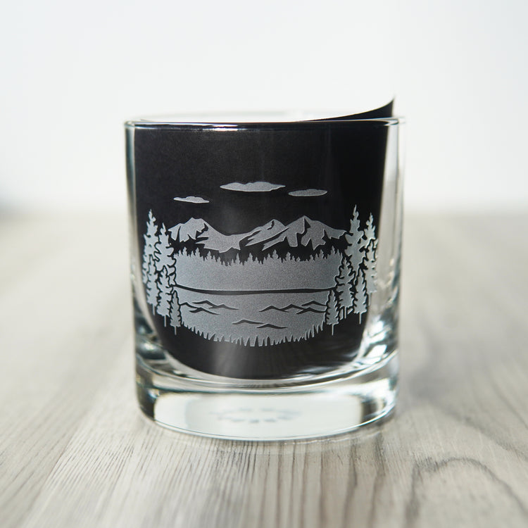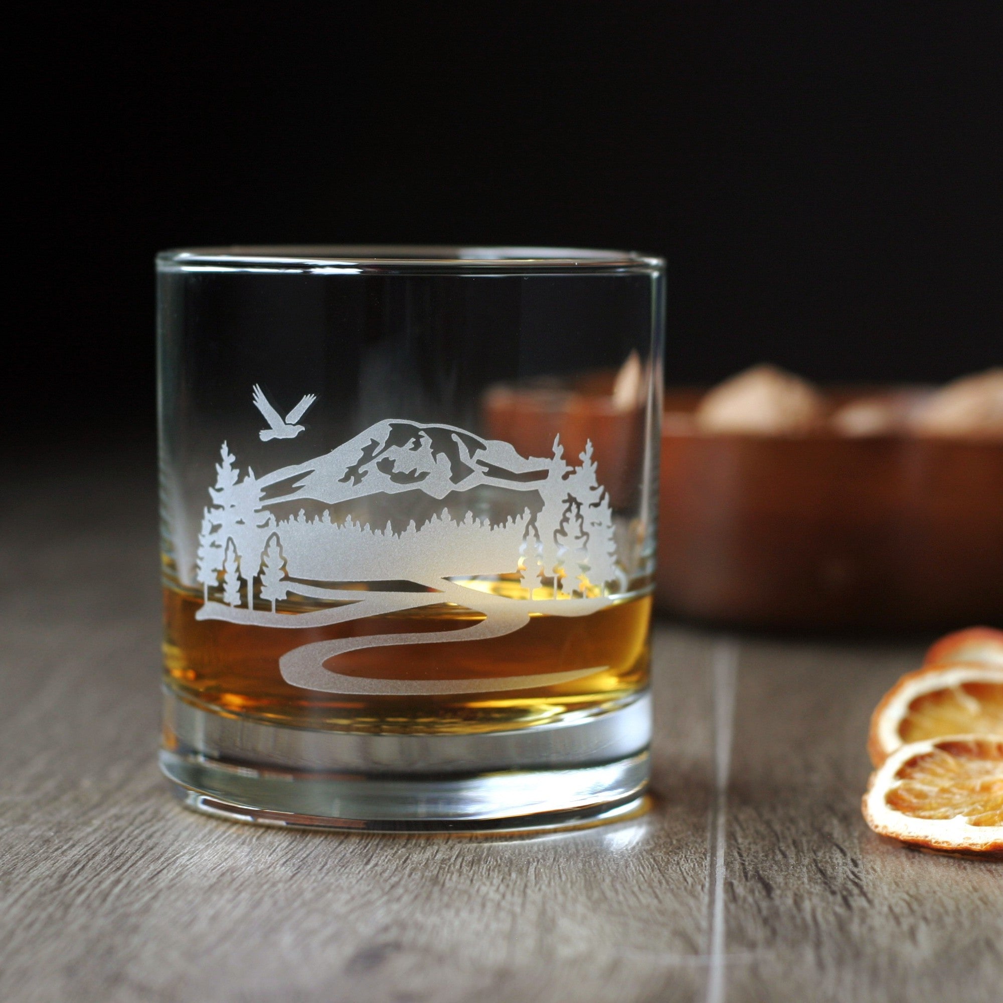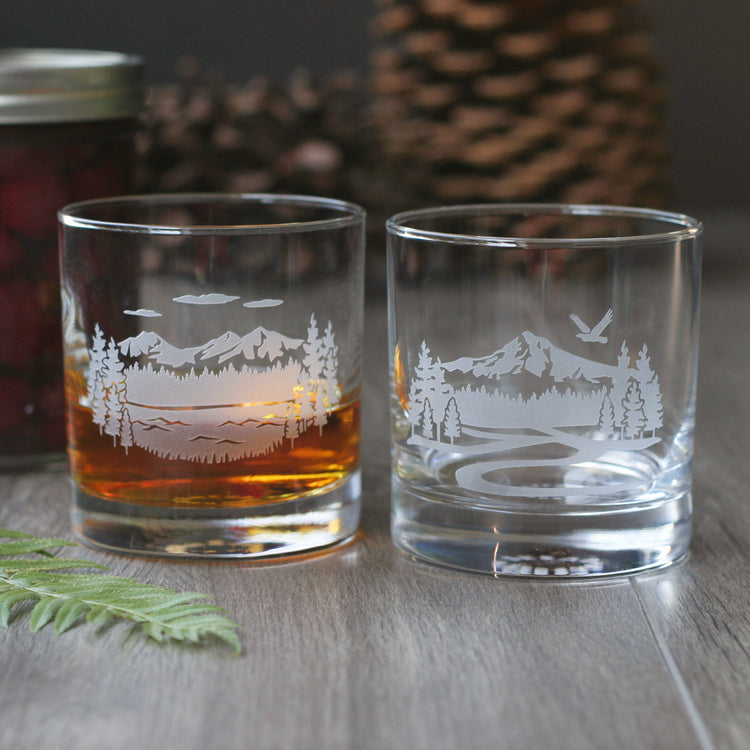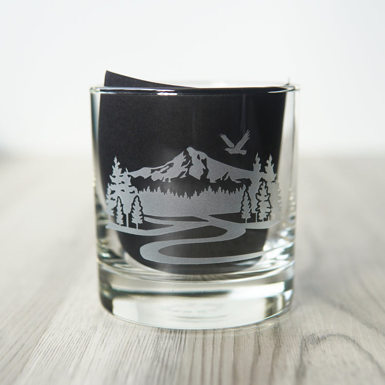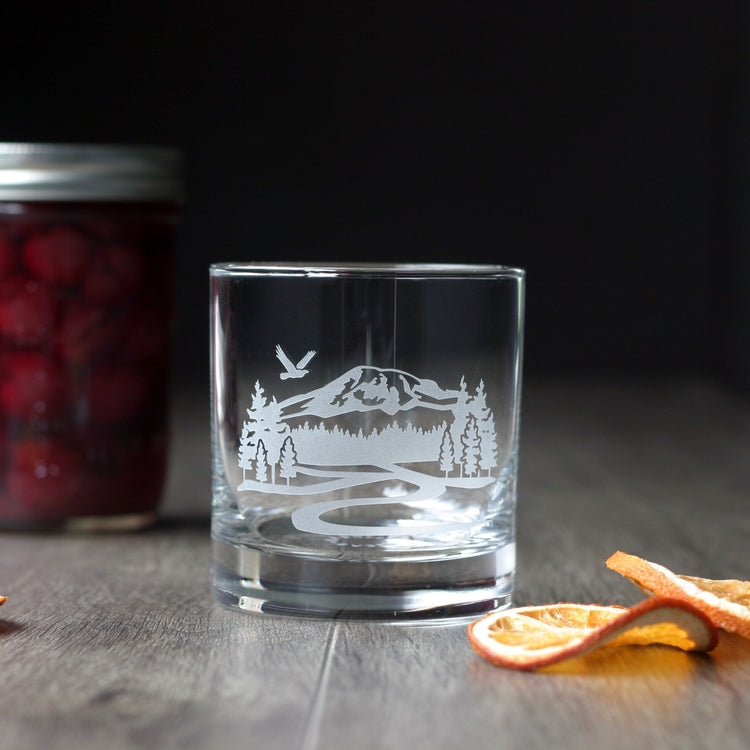This mountain trail cocktail glass features our original outdoorsy hiking design and makes a great gift for nature lovers. This glass features your choice of famous Pacific Northwest volcanic landmarks: the Three Sisters mountain range behind a calm lake in central Oregon, or Mt. Hood (in Oregon) or Mt. Rainier (in Washington) with a soaring bald eagle overhead.