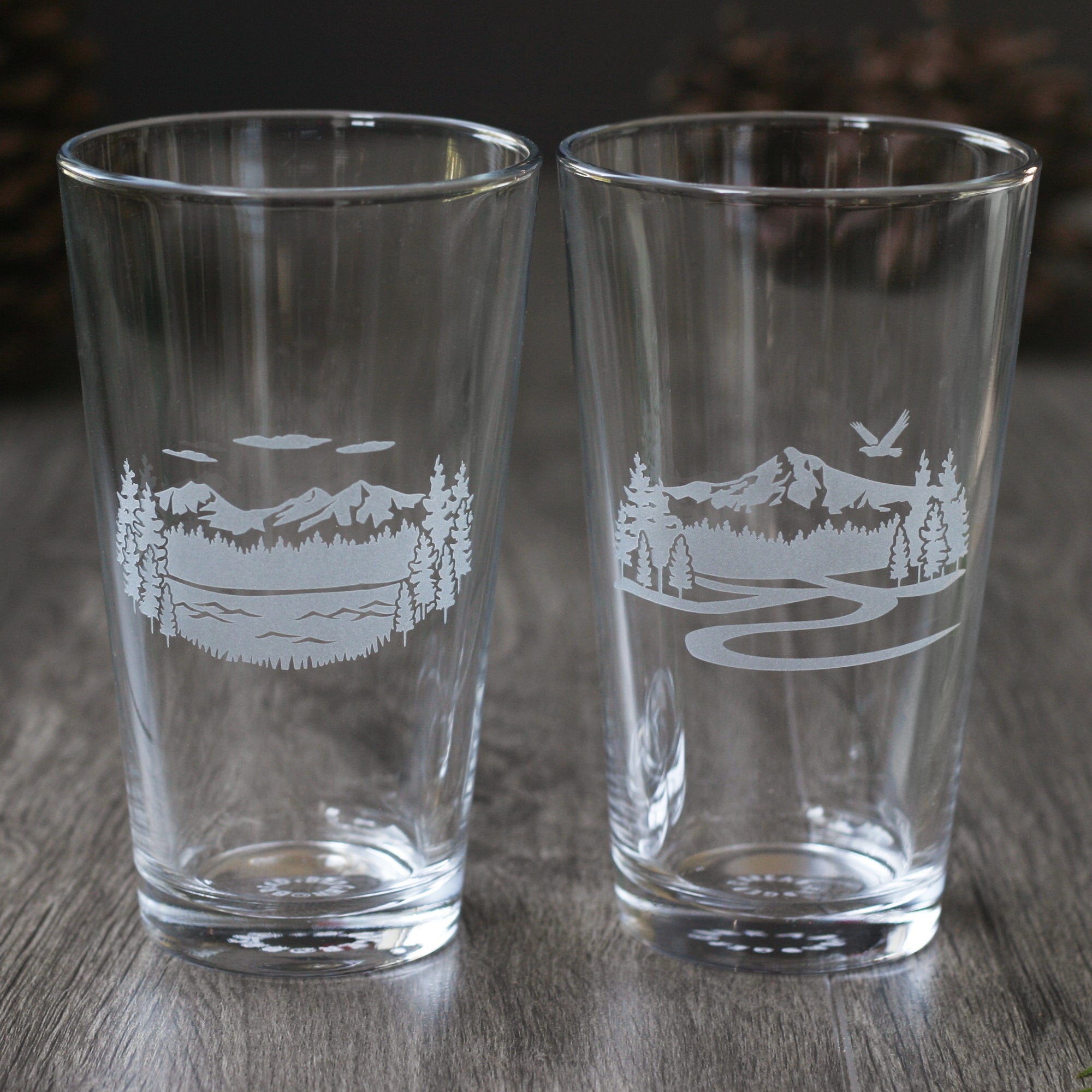 Celebrate your love of the great outdoors by taking your own path with these nature inspired pint glasses. Featuring your choice of famous Pacific Northwest volcanic landmarks: the Three Sisters mountain range behind a calm lake in central Oregon, or Mt. Hood (in Oregon) or Mt. Rainier (in Washington) with a soaring bald eagle overhead.