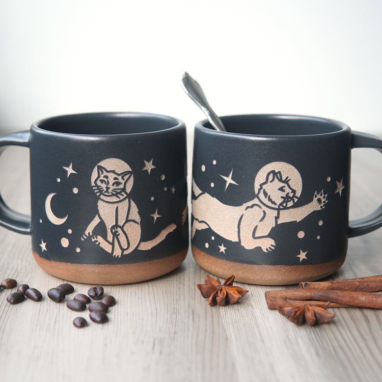Be part of the coolest space mission around with this awesome astronaut space cats mug! This handmade pottery mug features two cool cats chasing shooting stars, making your morning coffee extra out of this world!