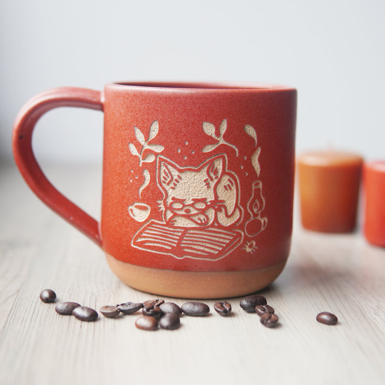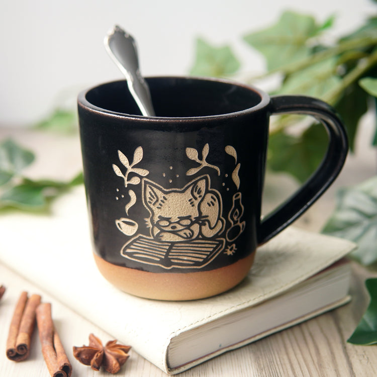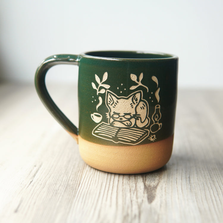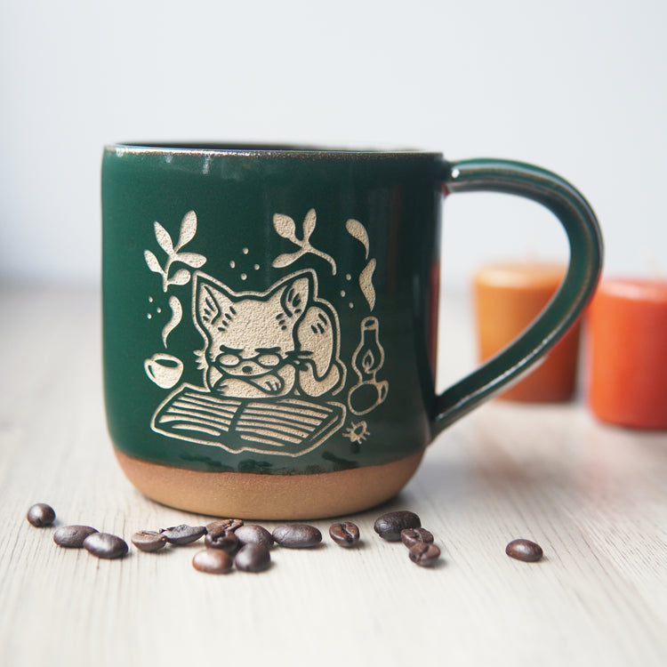 Cozy up while reading your favorite book with this Book Cat Mug! This handmade pottery mug features a contented sleeping cat design – the perfect gift for any bookworm.