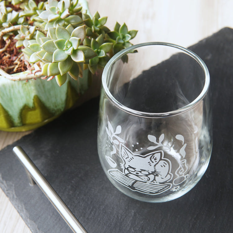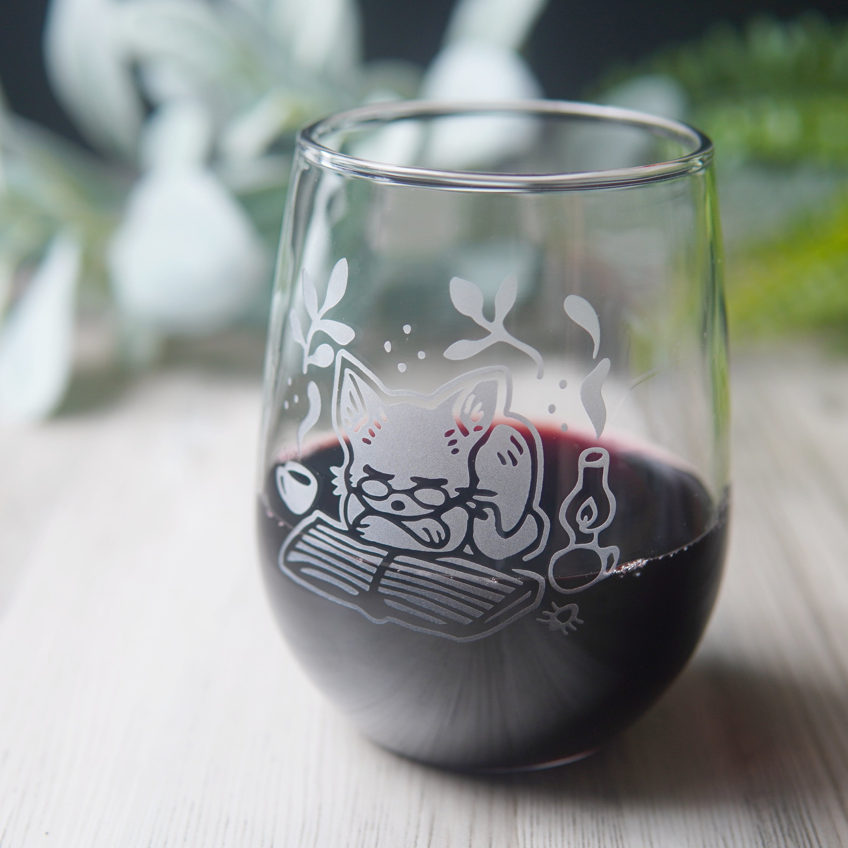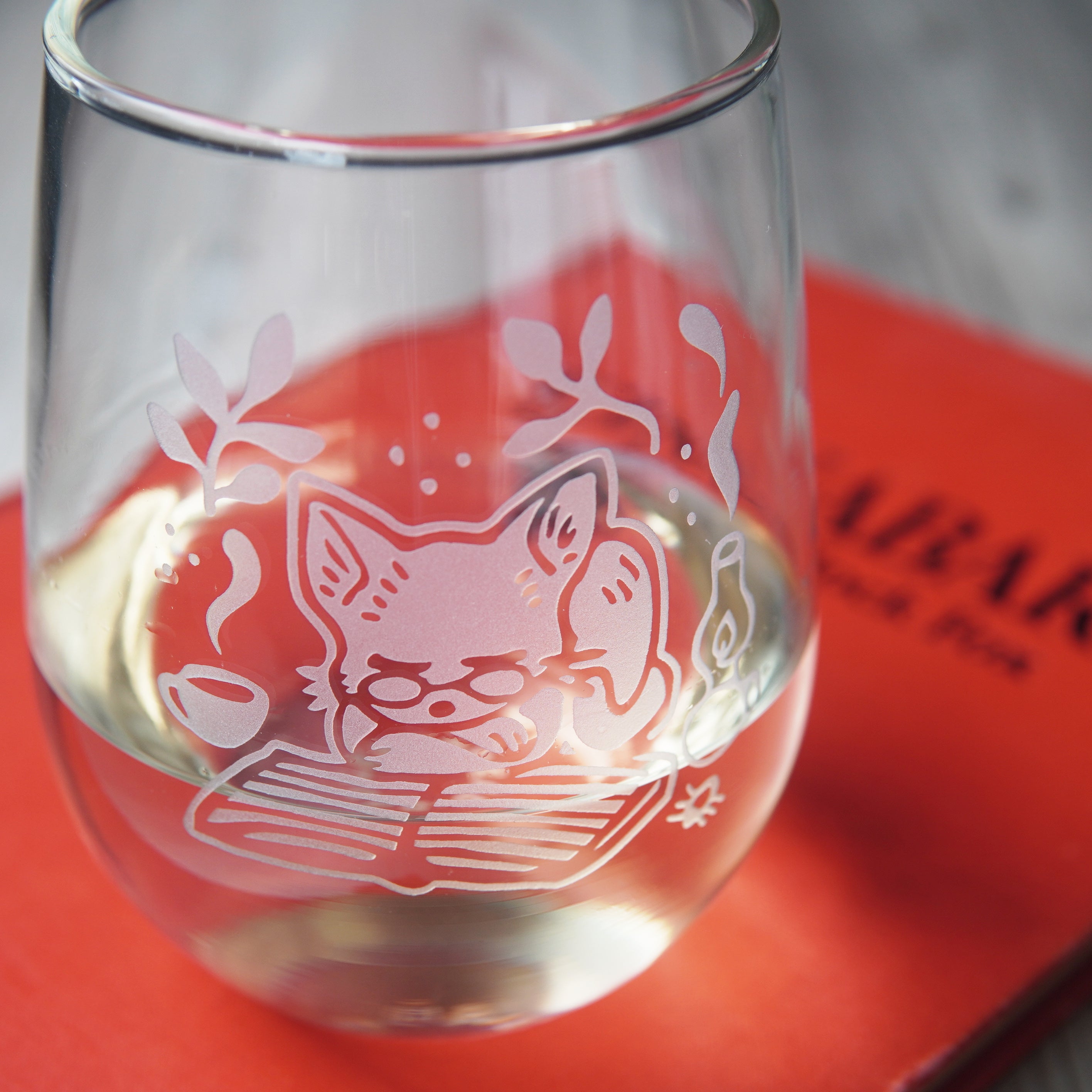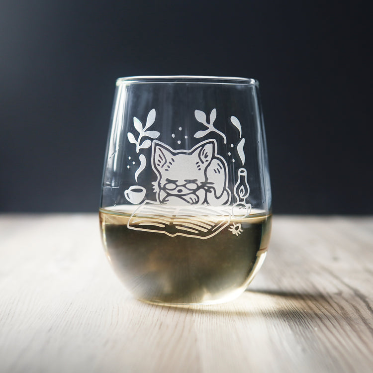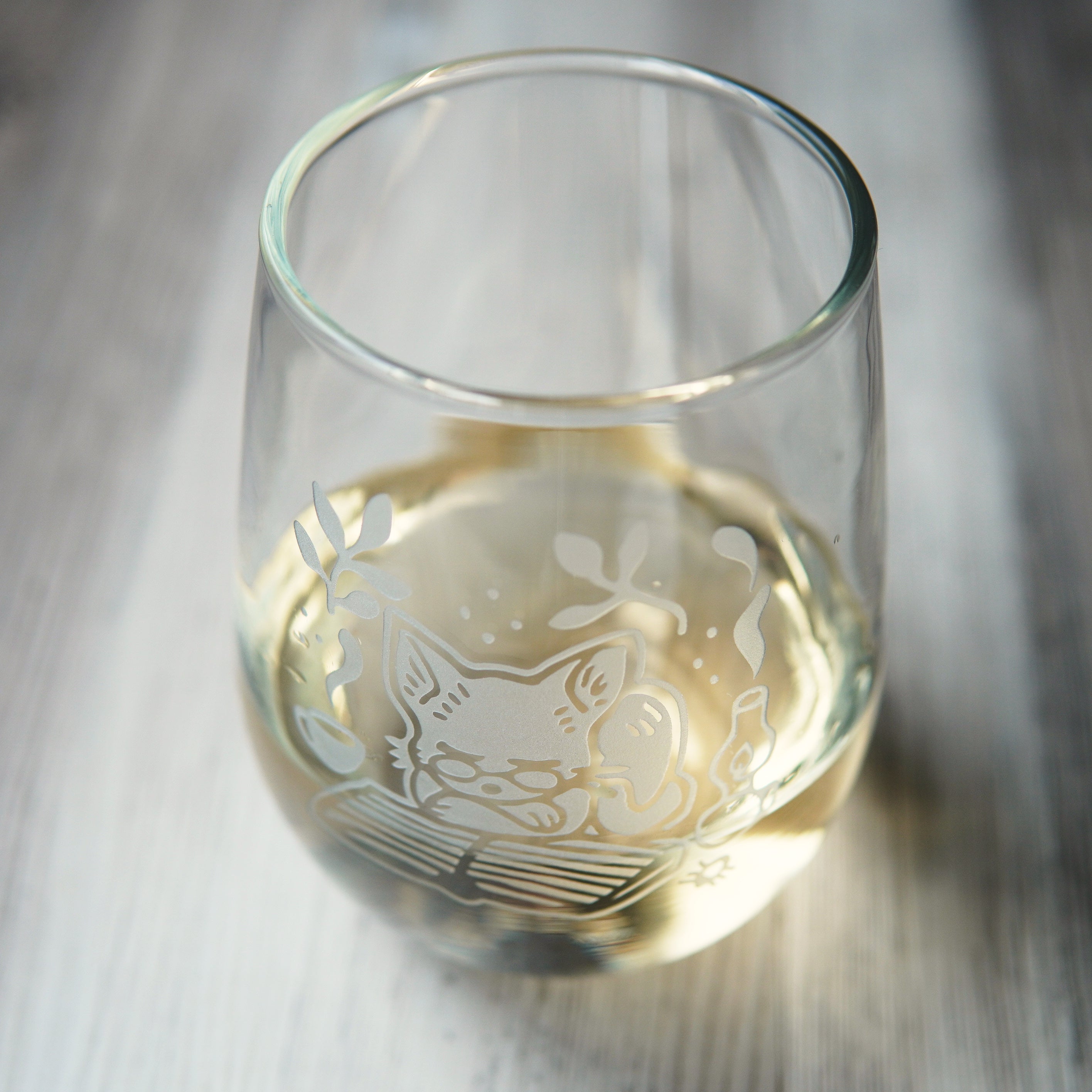 Open a world of cozy, cat-inspired wine nights with this Book Cat stemless wine glass. Perfect for book club gatherings and solo reading sessions alike, this etched glassware adds a purr-fectly fun twist to your evening beverage.