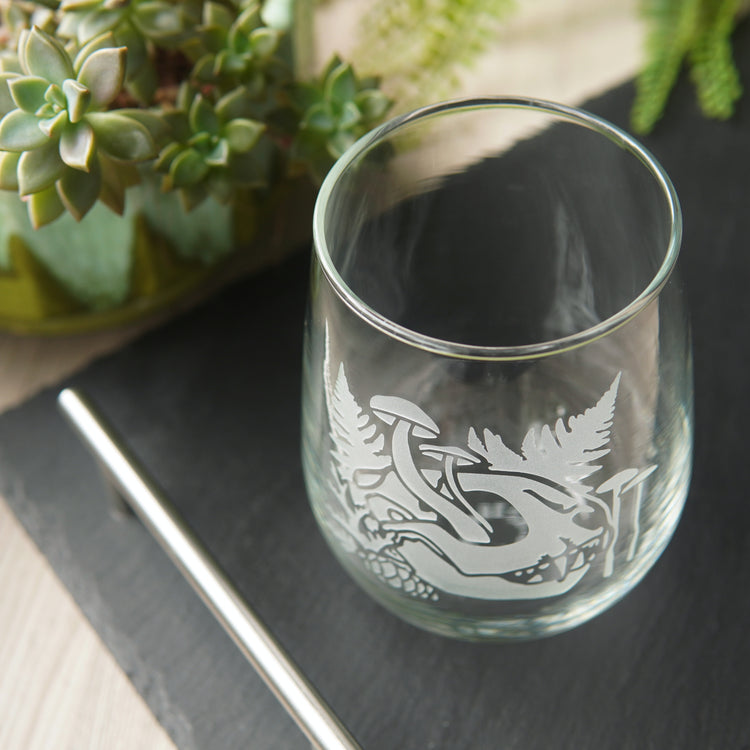 Raise your glass to rebirth and macabre beauty with our unique Decay Cat Skull stemless wine glass. Etched with a decaying skull amidst a dark forest floor, this glassware is a great way to celebrate something special, and the design will never fade or wear away.