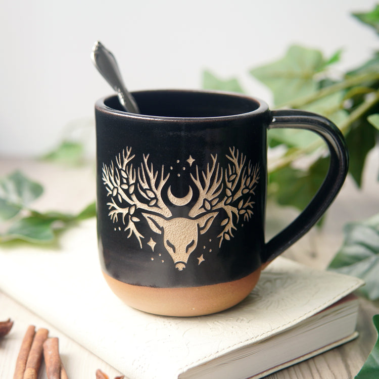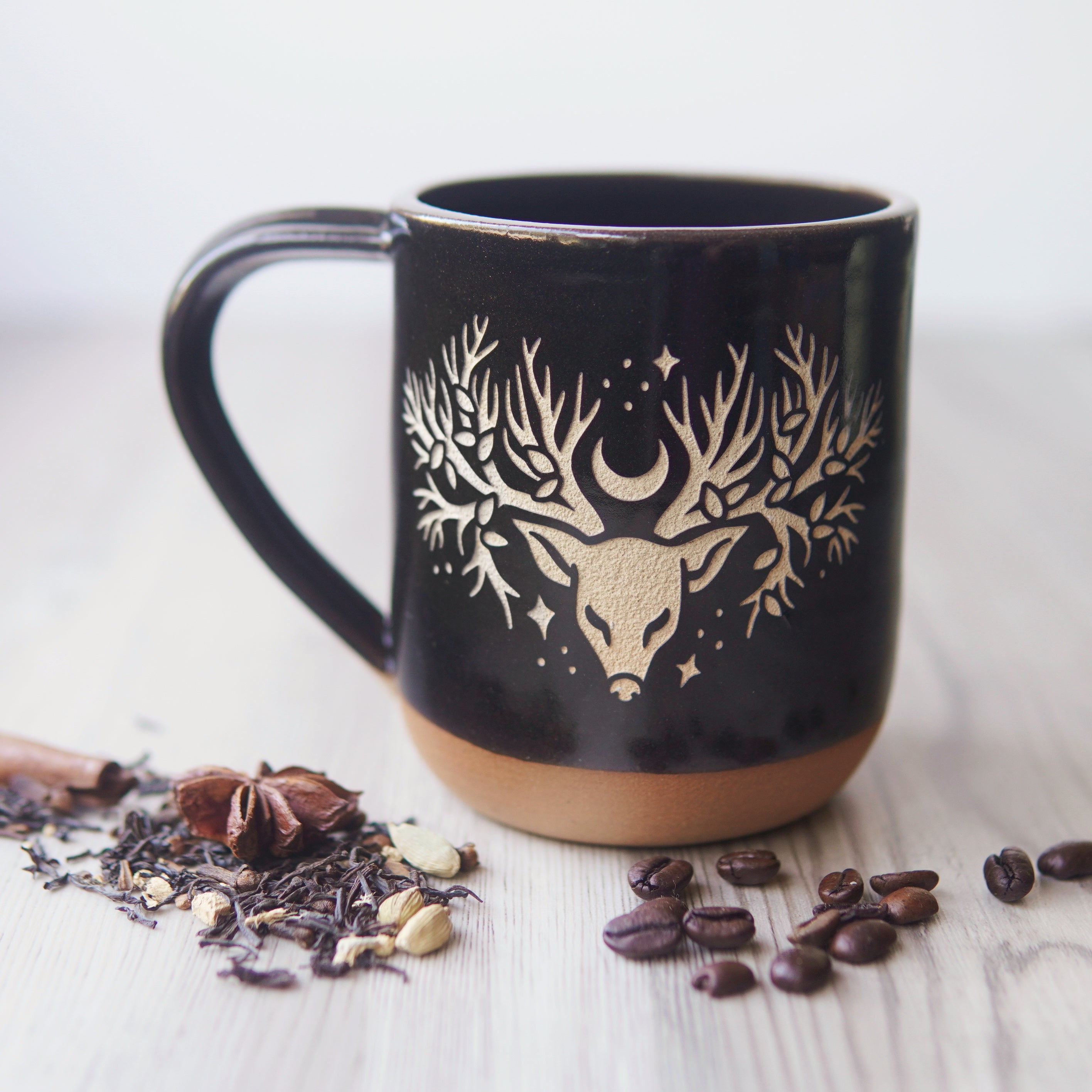 This handmade pottery mug brings rustic charm to your modern home. The imagery of a deer with tree antlers holding a crescent moon is inspired by the goddess Artemis/Diana (keeper of plants, wild animals, and the hunt) and makes a striking statement. Sip your favorite beverage in wild elegance while pondering the Roman empire.
