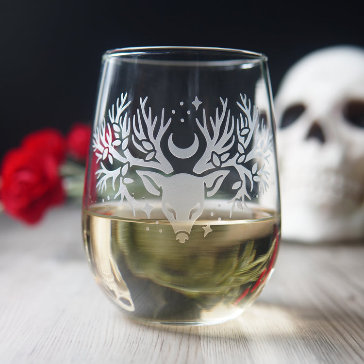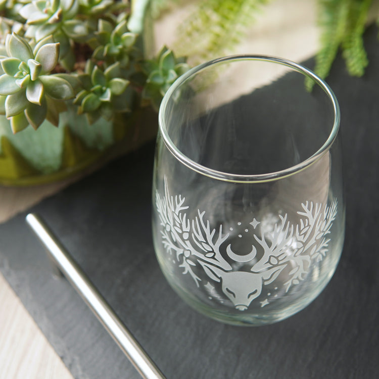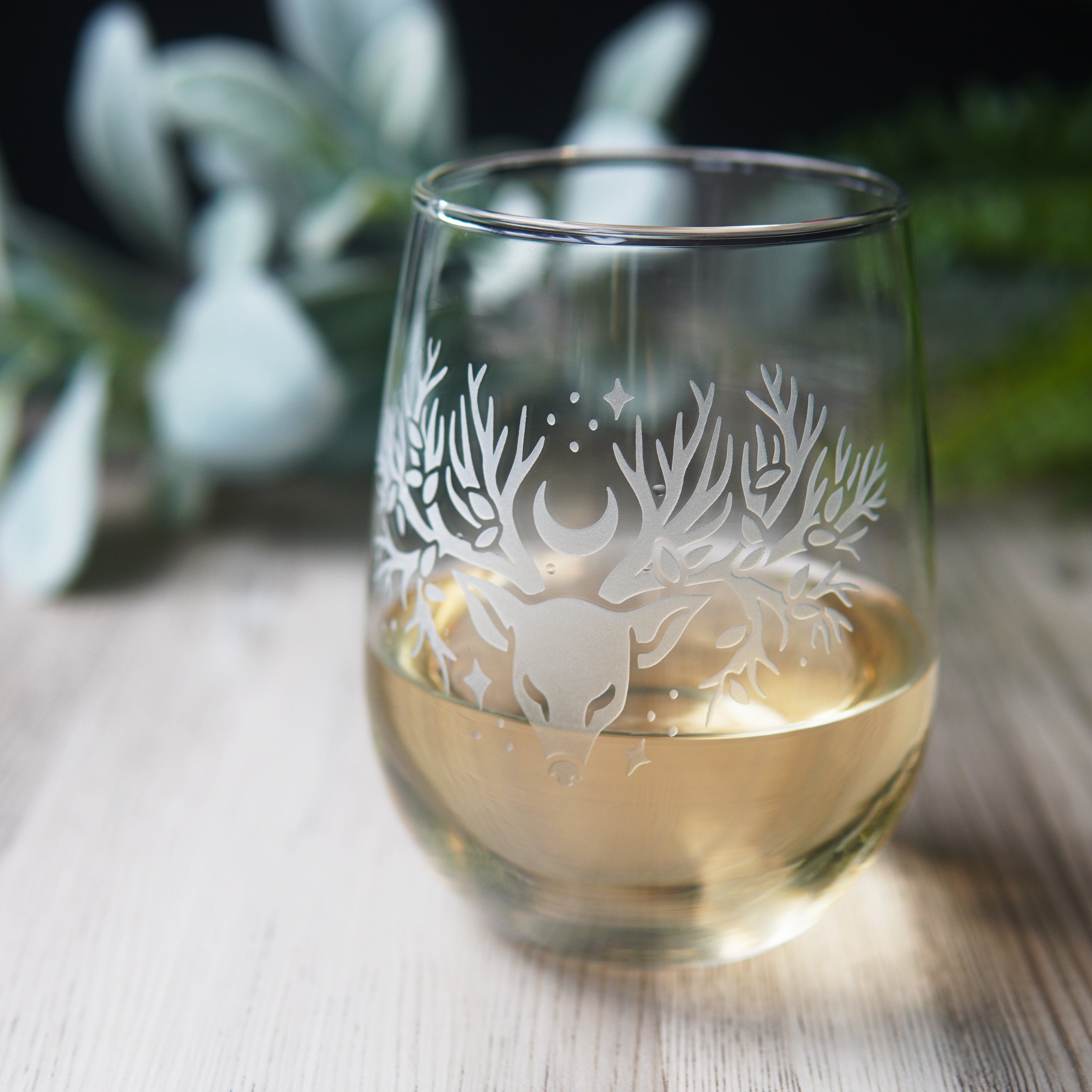 Sip your favorite vintage in style with this Deer Tree stemless wine glass. This exquisite piece features a delicate image of Artemis, the goddess of the moon, the hunt, nature, and wild animals, represented by a deer with tree branches for antlers. This etched glassware is sure to give your wine ritual the sense of luxury and sophistication it deserves.