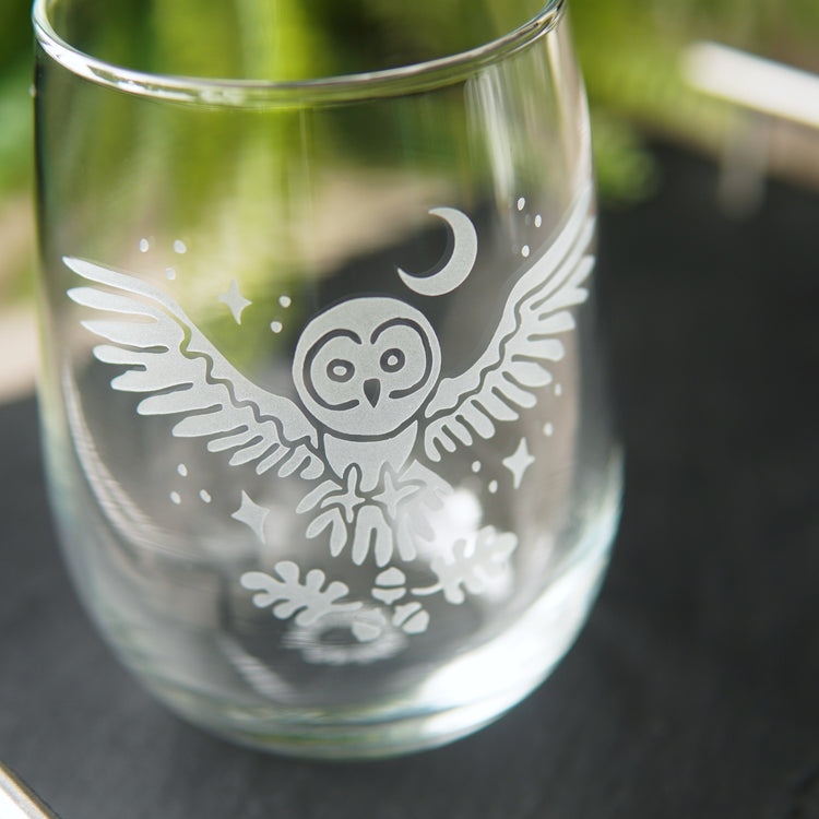 Sip and savor from our Owl + Oak Stemless Wine Glass. Featuring acorns to represent growth and new beginnings, and a swooping great gray owl to symbolize wisdom and transformation, this glassware embodies the beauty of nature. Raise a glass and savor the intuition of nature!