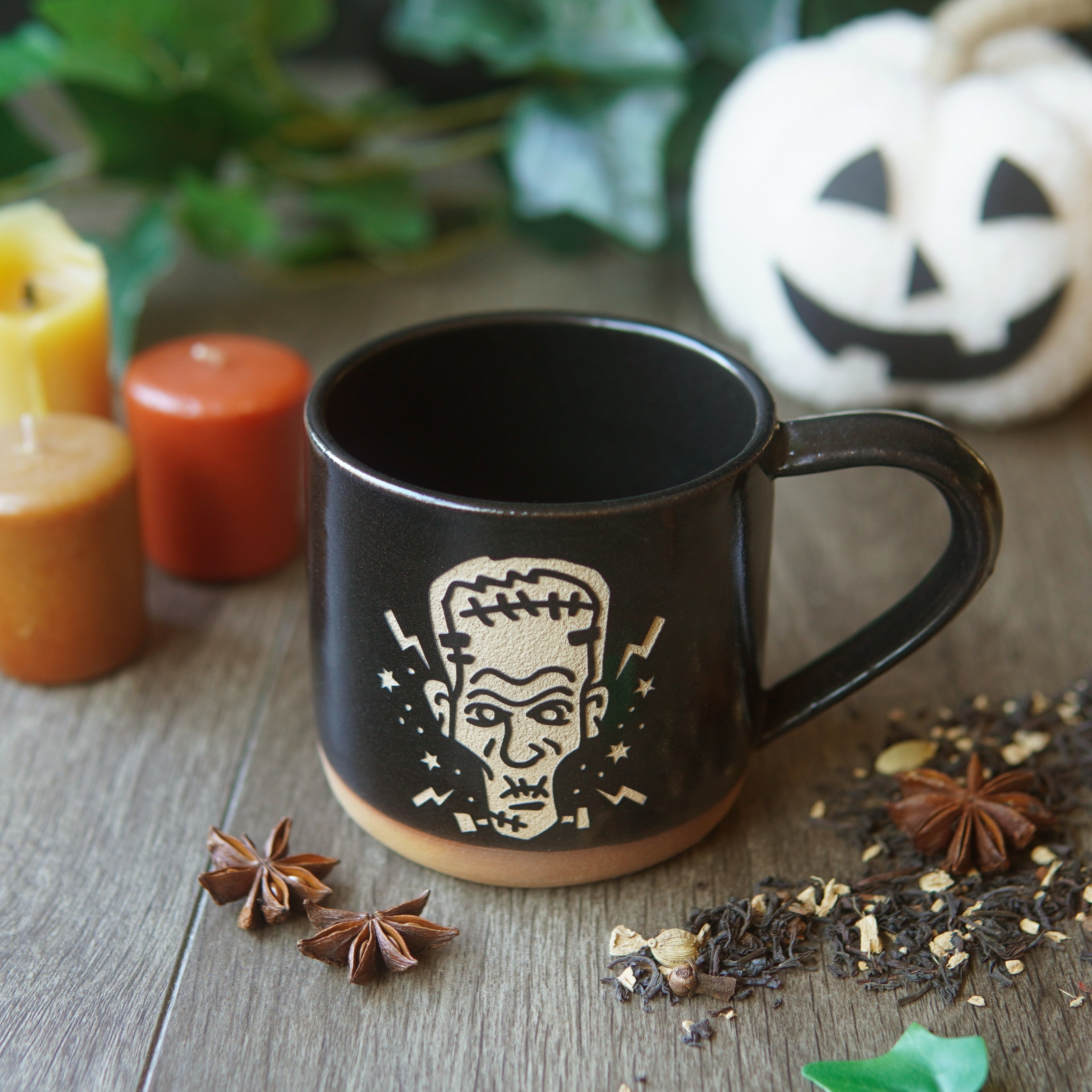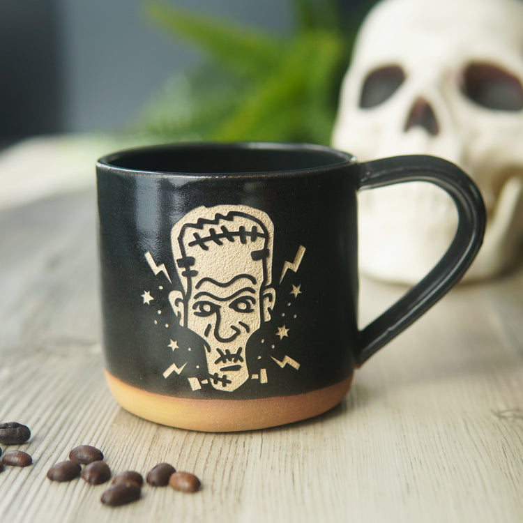 Jolt yourself back to life with our Frankenstein mug! This handmade pottery monster mug adds a touch of classic horror to your goth kitchen so you can celebrate Halloween all year long.