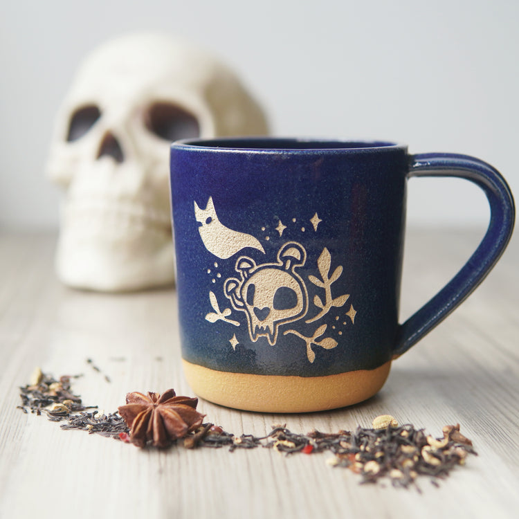 This Haunted Cat Skull Mug adds a whimsical touch to any home with our farmhouse-style handmade pottery. Engraved smoothly, the cute ghost cat skull design is sure to charm guests with its dark forest motif and mushroom details. Perfect for giving or keeping, this mug is a timeless piece sure to elevate any cozy drink.