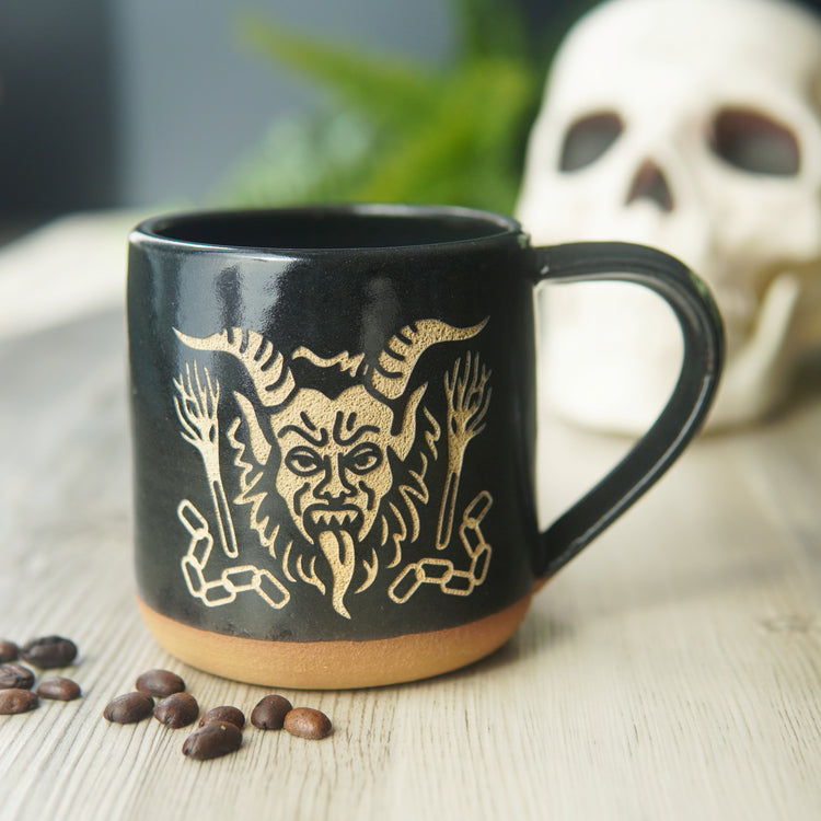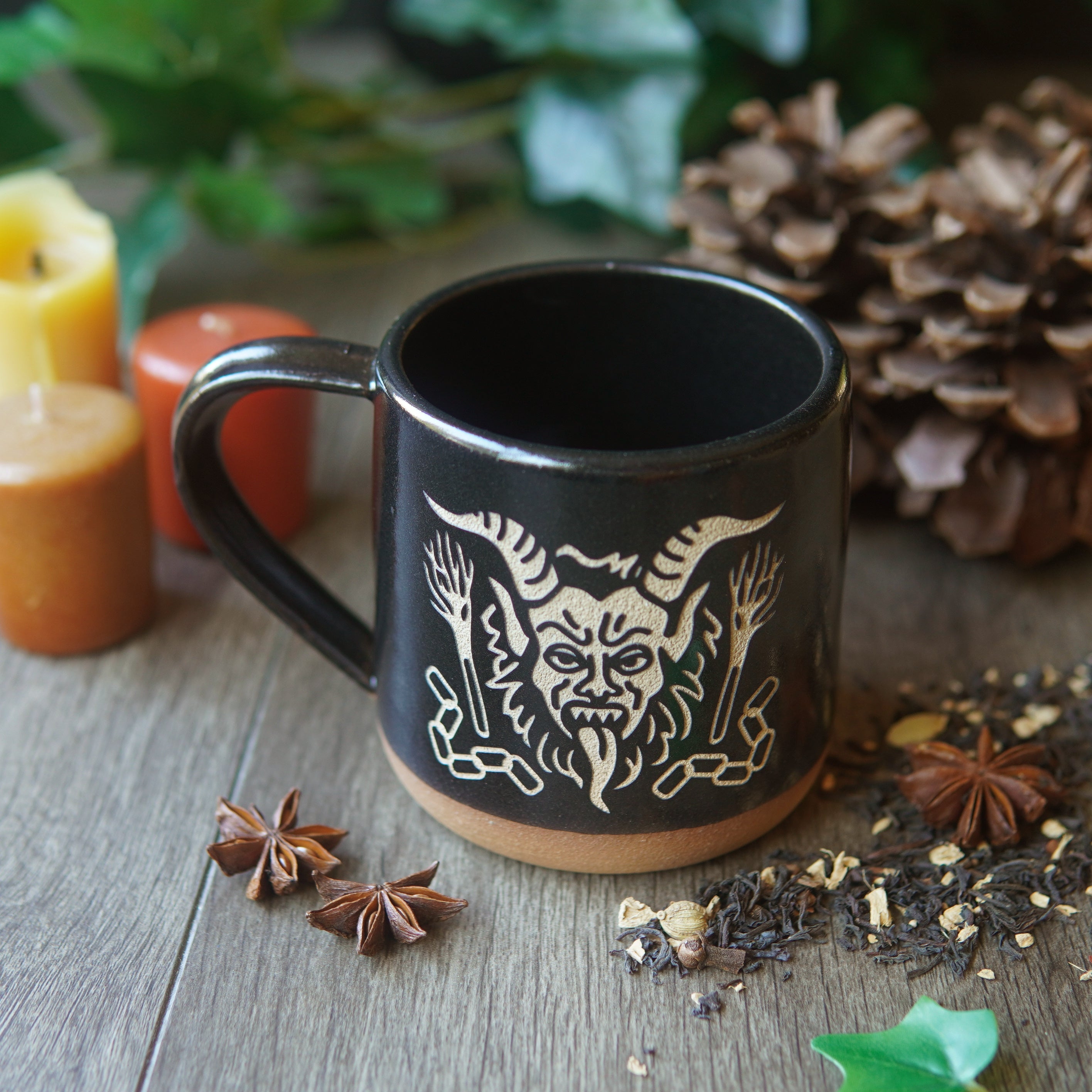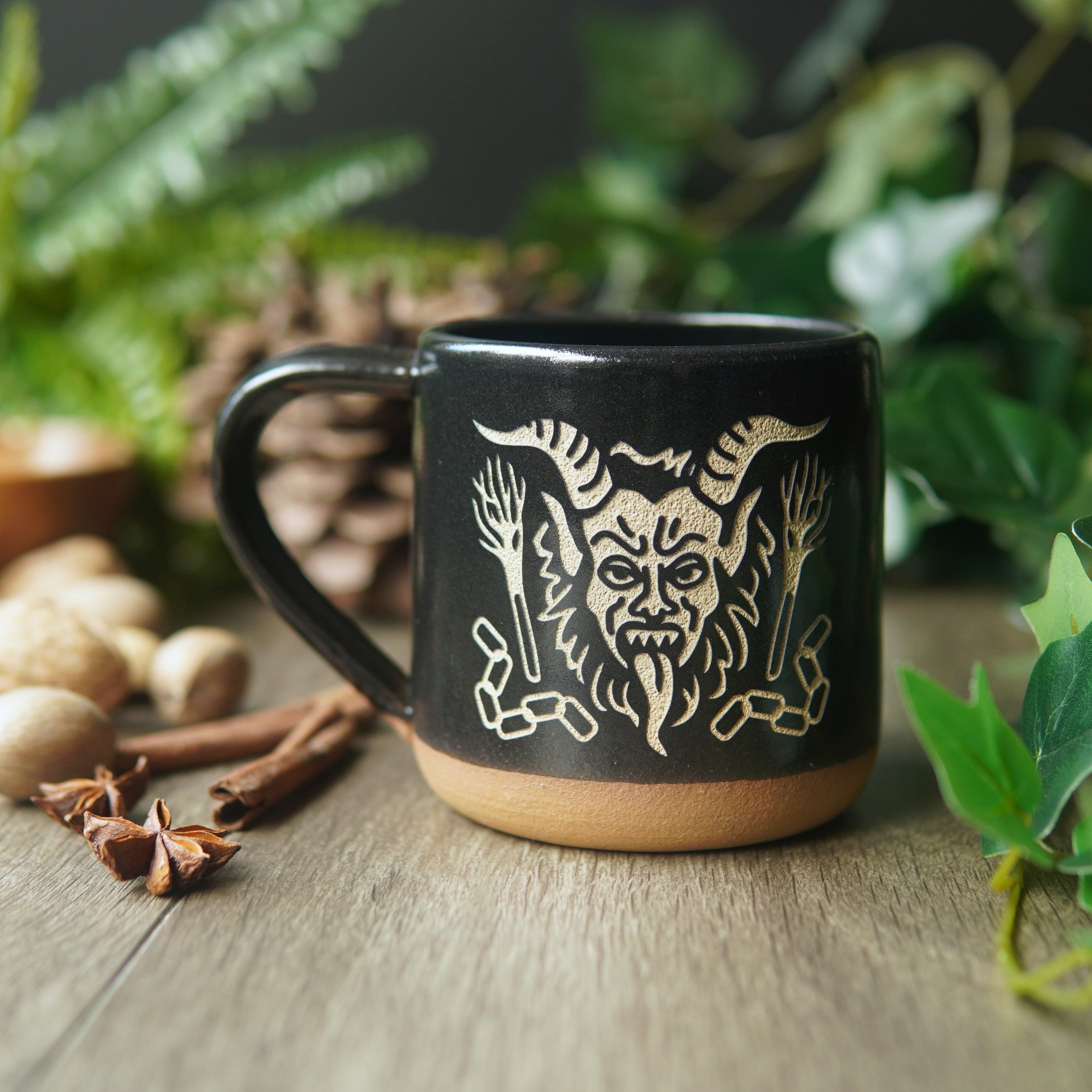 Celebrate the winter holidays (or your inner mischief) with this handmade Krampus mug. Featuring the Christmas demon who punishes naughty children, this mug adds a touch of creepy playfulness to your morning coffee. A unique and quirky addition to your mug collection for the winter solstice.