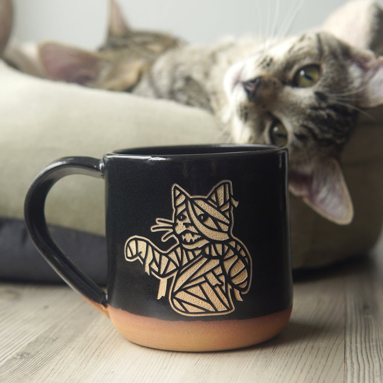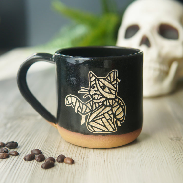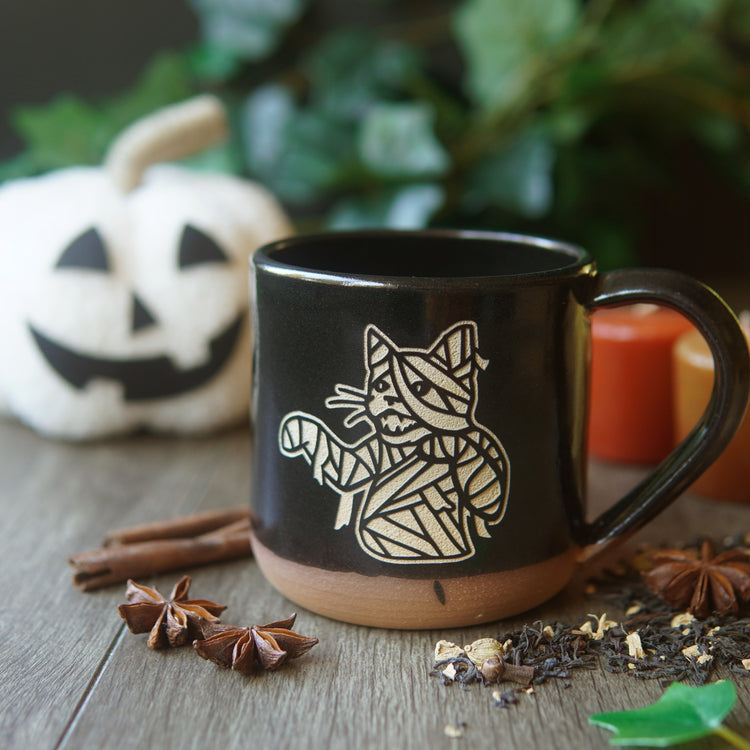 Embrace your spooky style with our Mummy Cat Mug! This adorable handmade pottery mug is perfect for Halloween or everyday to add a touch of classic horror to your aesthetic. Warn everyone to avoid the cat mummy's curse by leaving you in peace until you've finished your coffee.