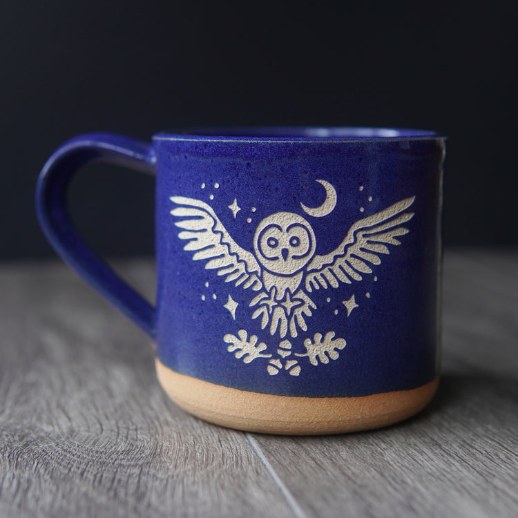 Sip your morning brew in style with this handmade Owl + Oak mug! With a great grey owl swooping over oak leaves and acorns in a starry night sky, this farmhouse-style mug adds a unique rustic touch to your coffee ritual. This outdoorsy mug is the perfect vessel to help you celebrate your inner wisdom and bring the transformation you seek.