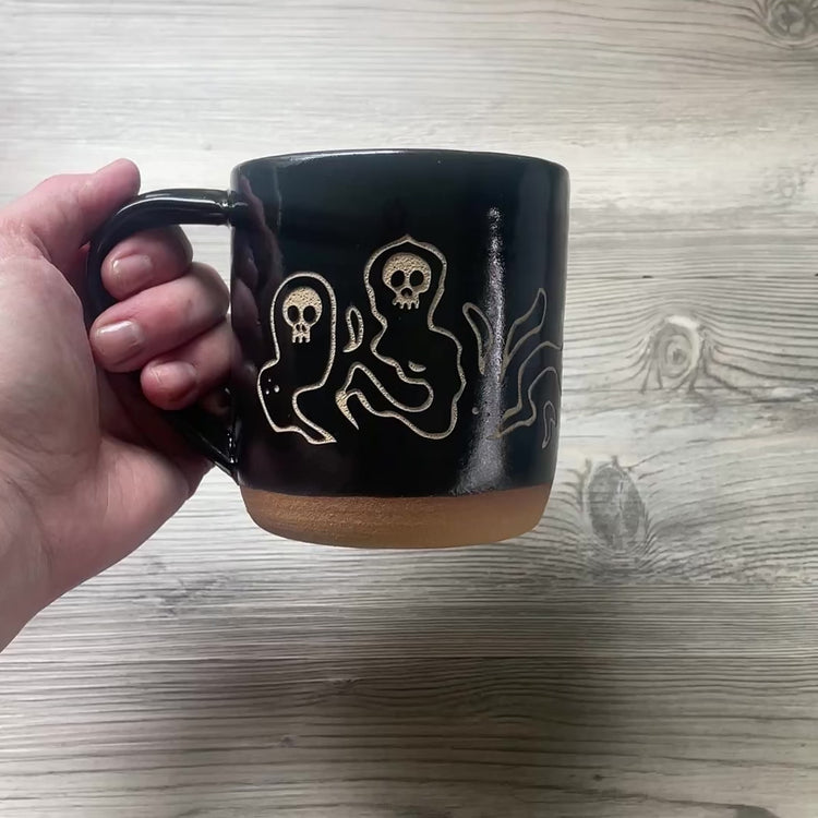 Our Wraith Mug is a hauntingly beautiful piece of handmade pottery. Its ghostly design features apparitions of floating skulls cloaked in wispy vapor. Perfect for adding a spooky touch to your Halloween or goth decor. Embrace the otherworldly mystery of this paranormal mug.