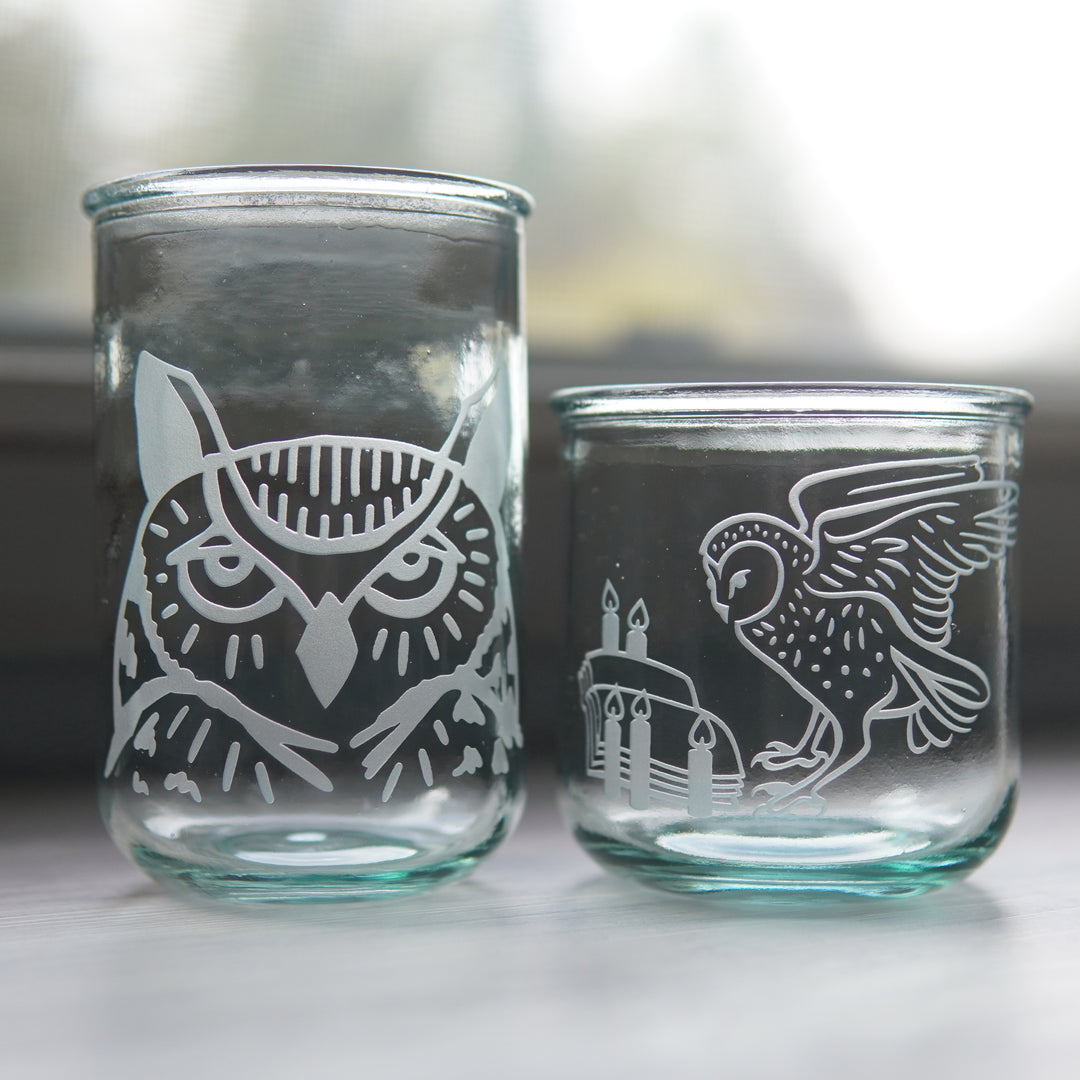 Glass drinkware in a variety of styles with our original artwork sandblasted into the surface. Our graphics are absolutely permanent, dishwasher-safe, and will last a lifetime. Find your new favorite pint glasses, cocktail glasses in highball or lowball (double old fashioned) shapes, wine glasses, and recycled glass tumblers and candle holders.