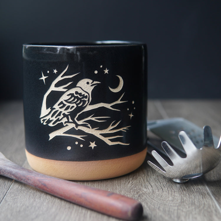 Our Crow kitchen utensil holder is the perfect piece of handmade pottery for channeling mysterious vibes into your kitchen. Featuring a dignified crow perched on bare tree branches beneath a crescent moon and stars, it's perfect for adding a reminder of death and rebirth to your home.