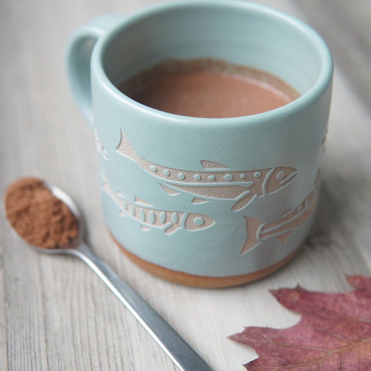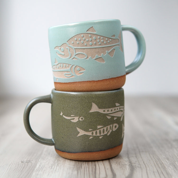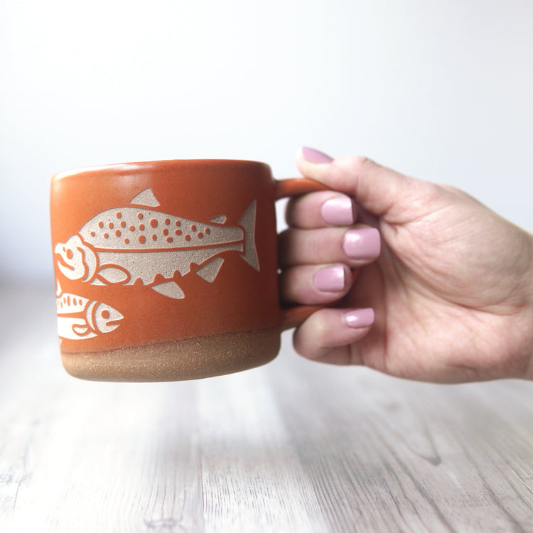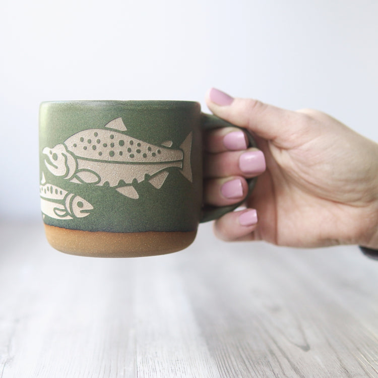Our engraved salmon mugs bring rustic charm to your home or fishing cabin. Perfect for folks who like to fish, especially dads and grandfathers. The wraparound design shows salmon in different stages of development, with a full-grown sockeye salmon swimming back upstream to spawn.