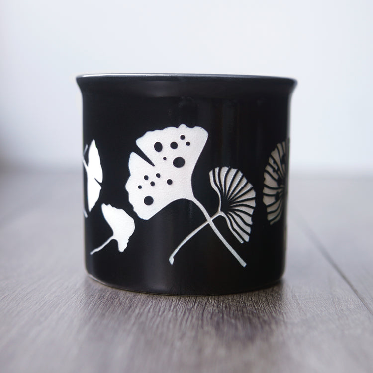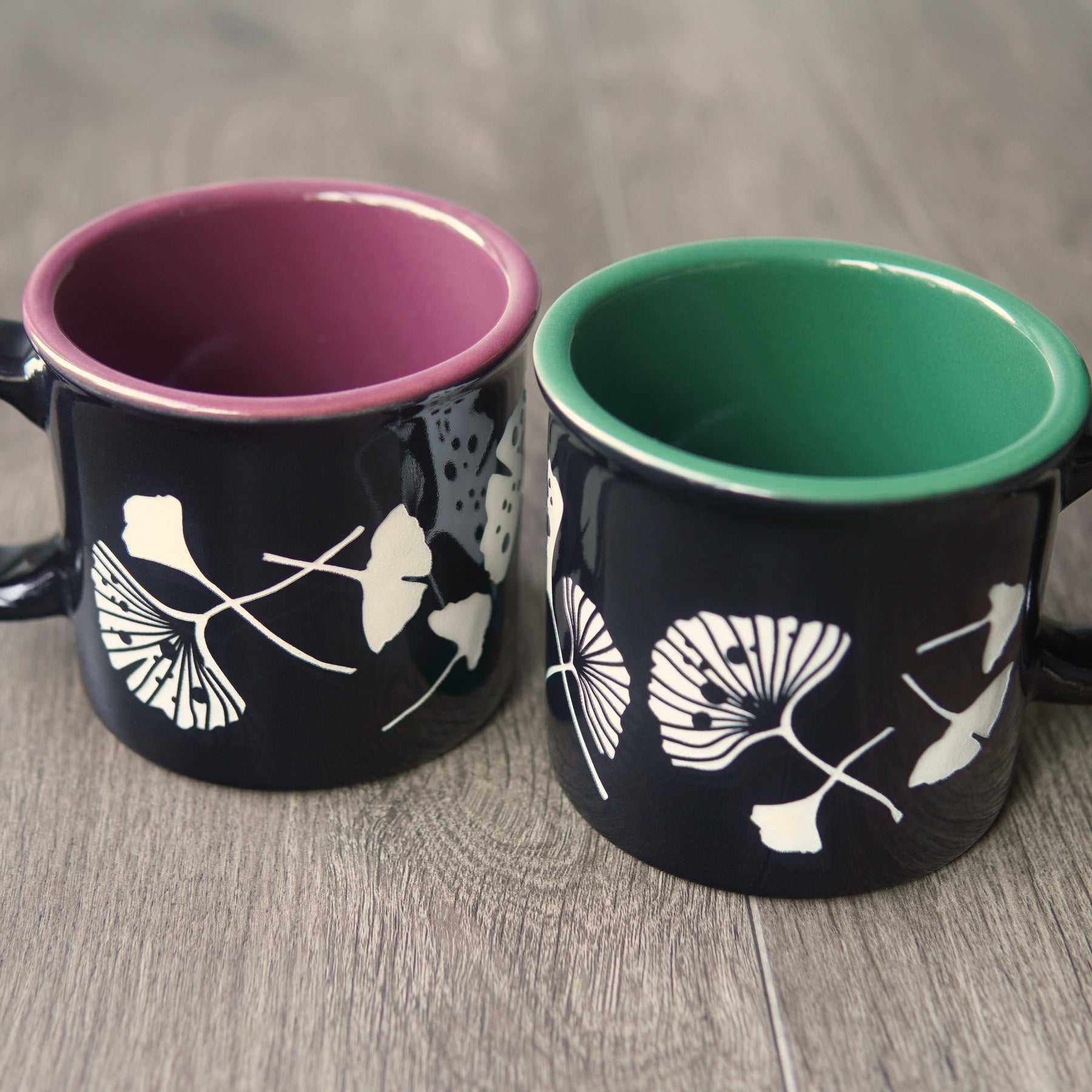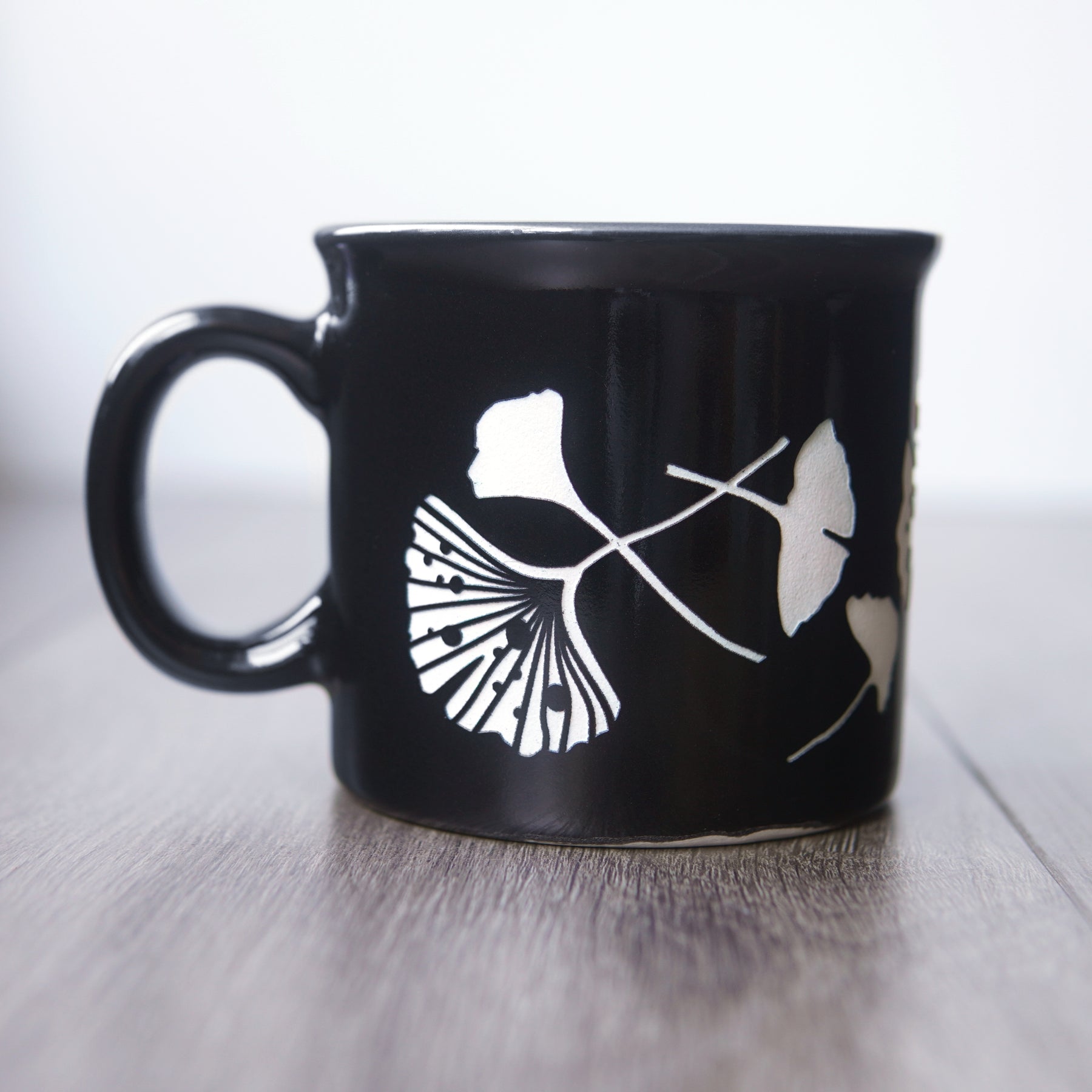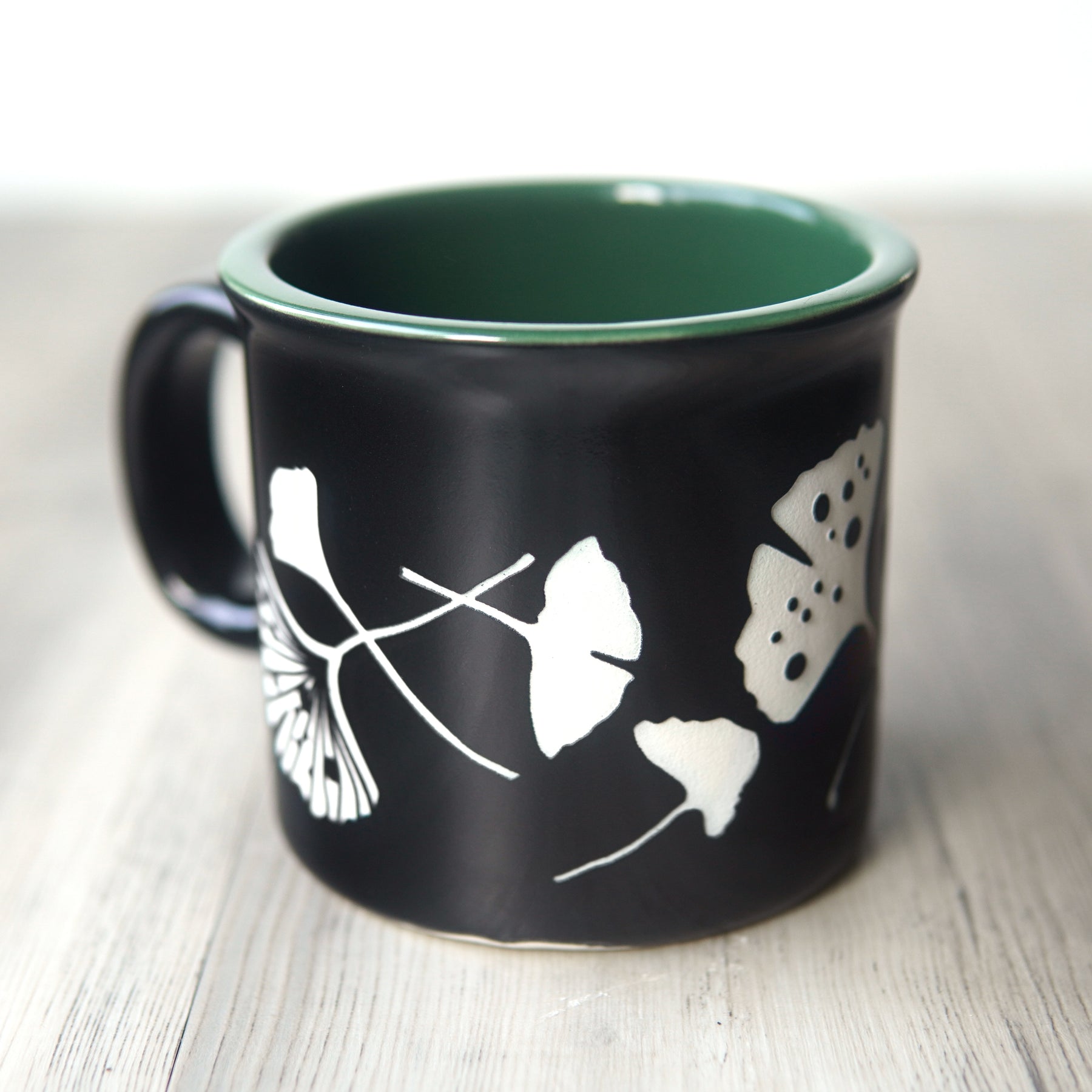 Get cozy while sipping your favorite hot tea from our Ginkgo leaf mug. This two-tone colored USA-made mug is shiny black on the outside, with your choice of color on the inside. It features pretty ginkgo leaves sprinkled with dewdrops sandblasted through the glaze layer, wrapping from the front to the back. This leafy floral mug is for people who appreciate the calm of watching sunlight dapple leaves as the seasons change.