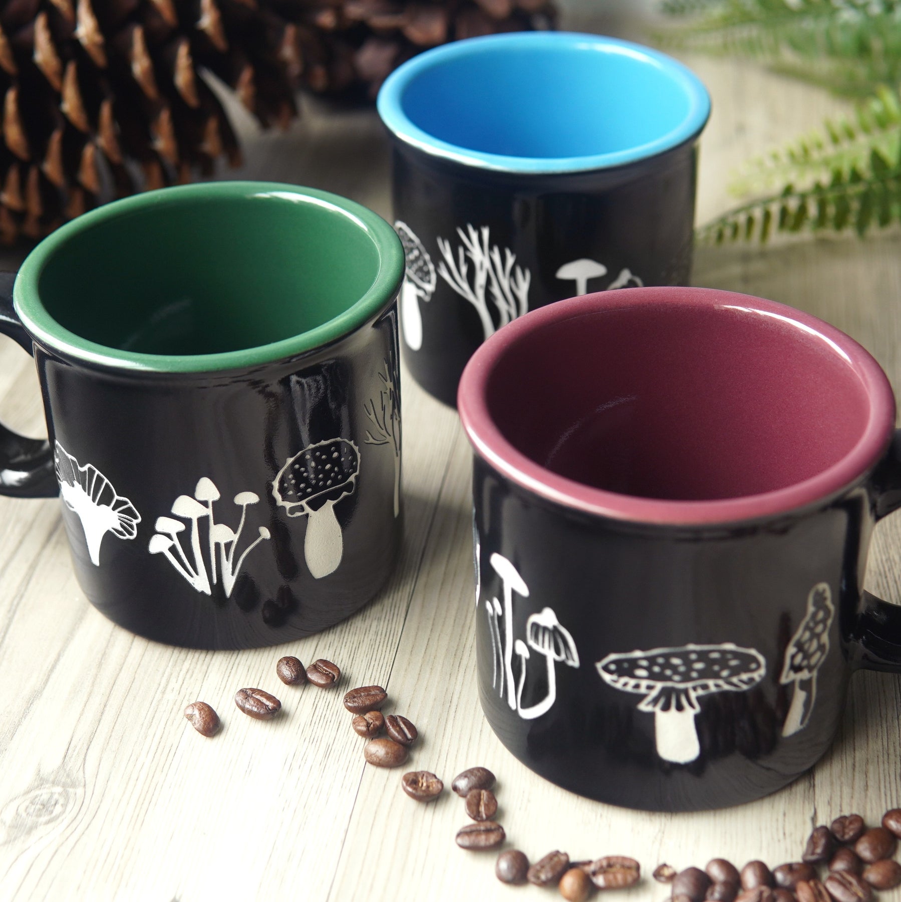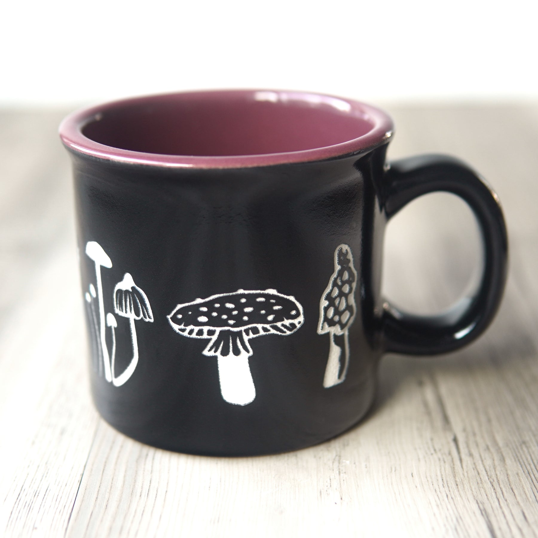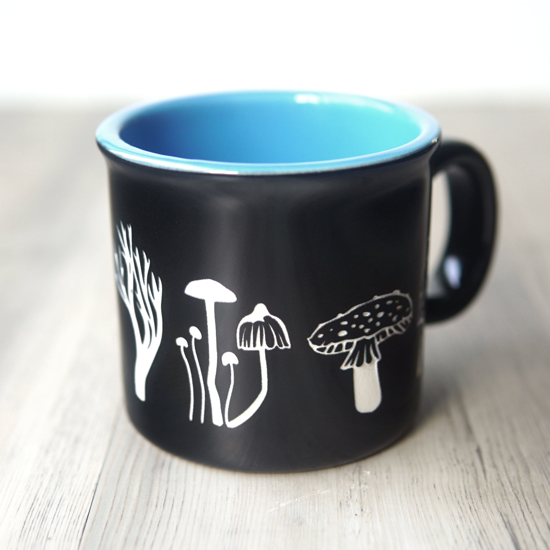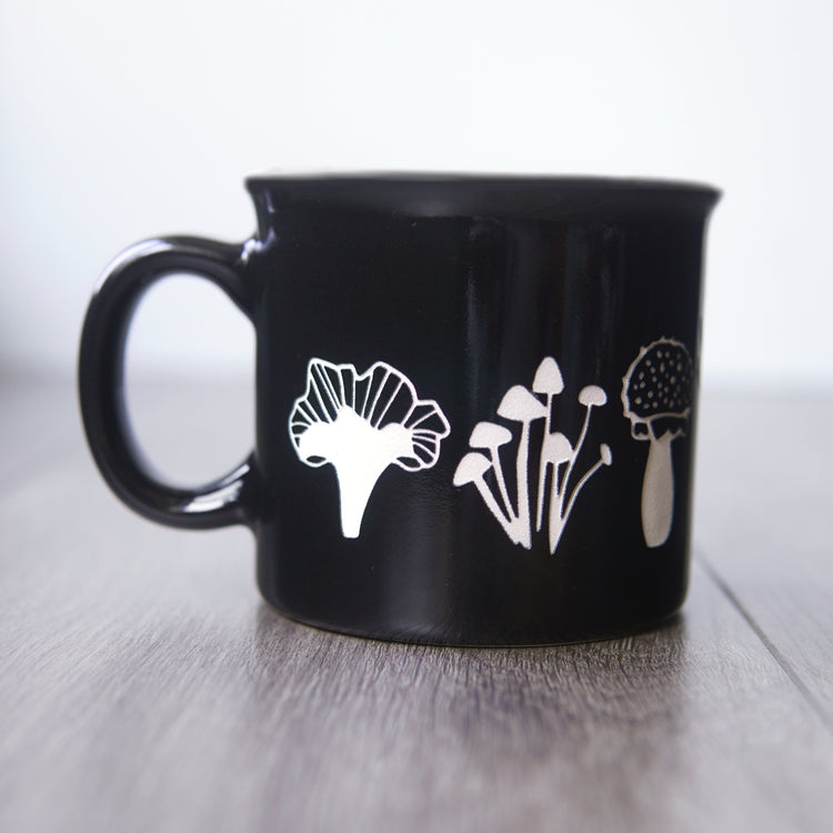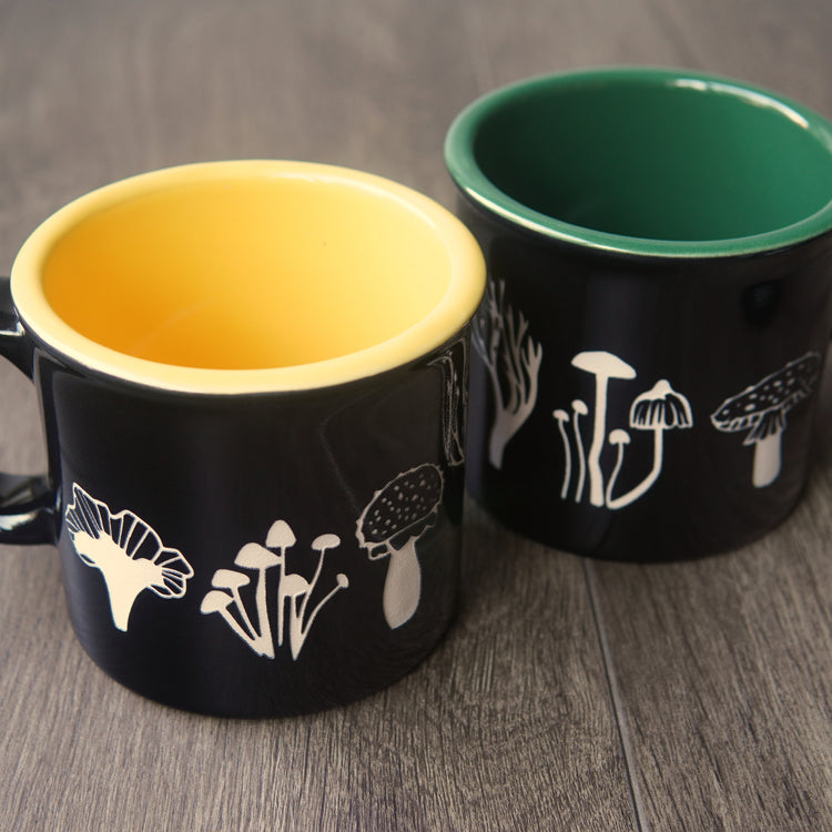 Get cozy while sipping your favorite coffee, tea, or mushroom beverage with our Mushroom Collection mug. This two-tone colored USA-made mug is shiny black on the outside, with your choice of color on the inside. It features various edible and toxic mushrooms sandblasted through the glaze layer, wrapping from the front to back. The perfect gift for any fungi forager!