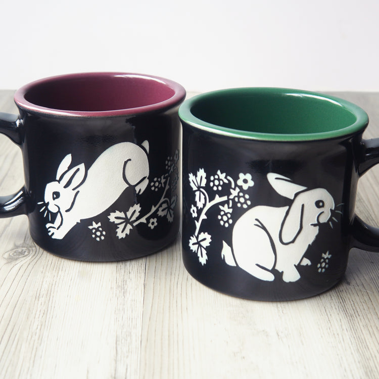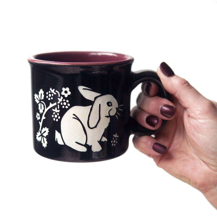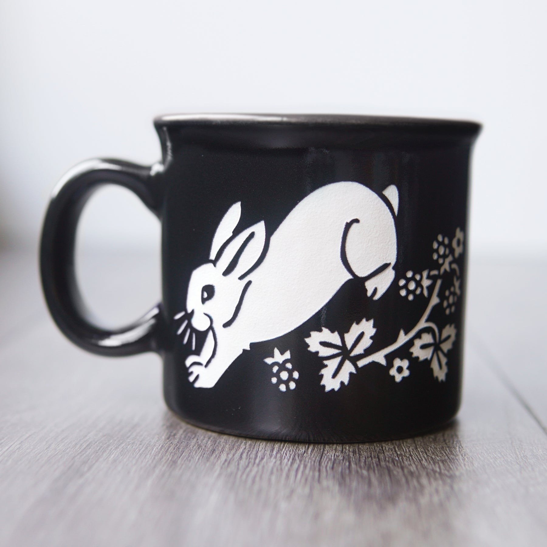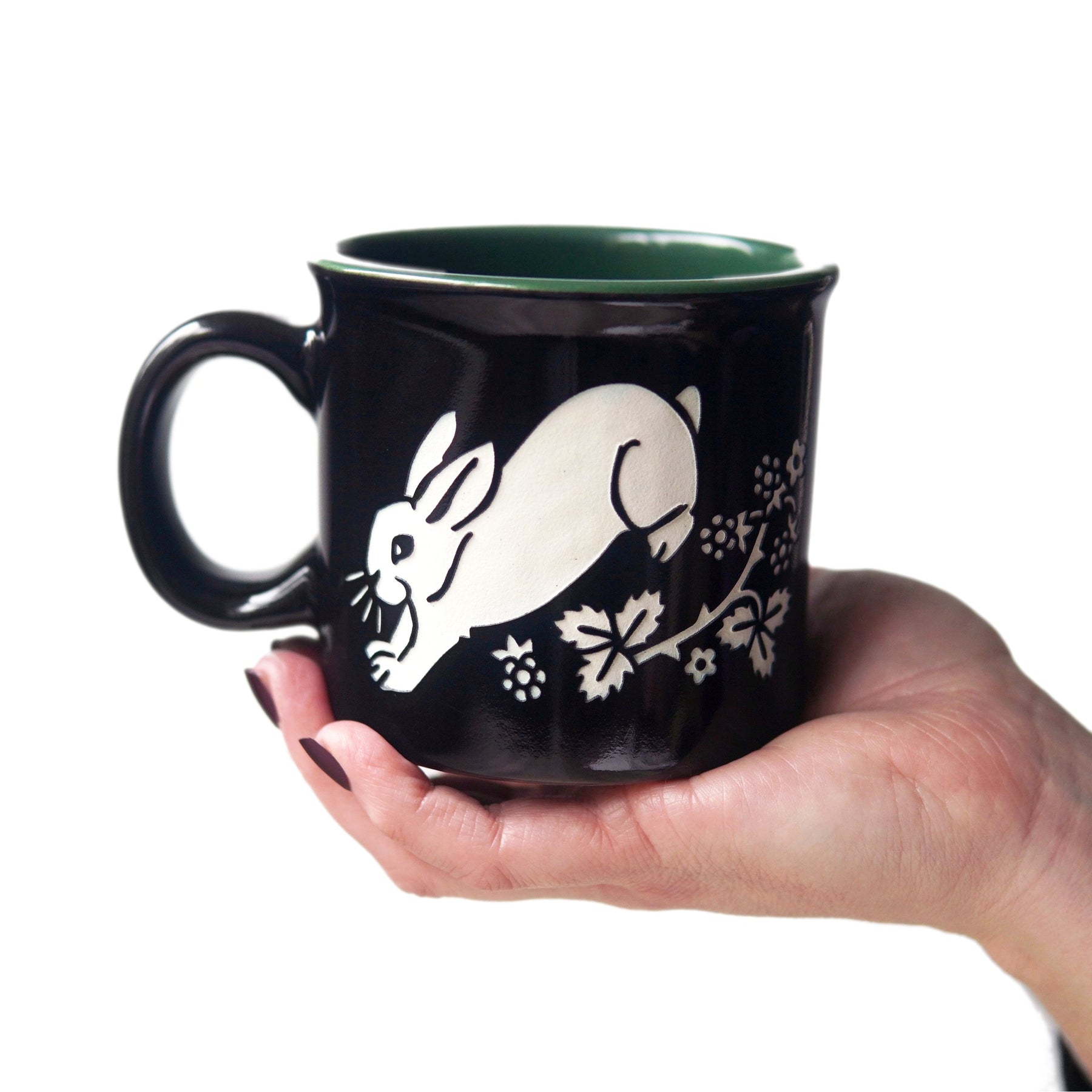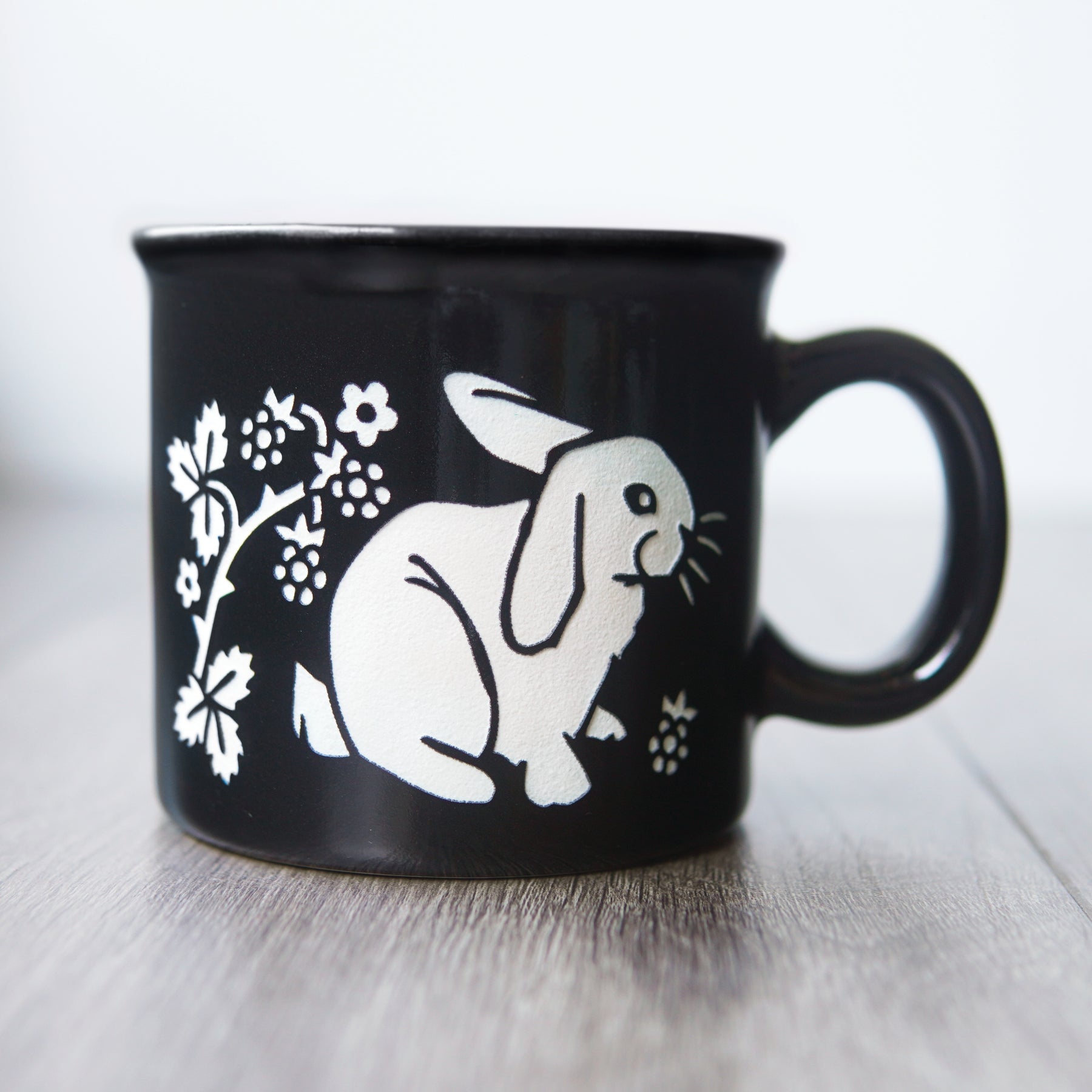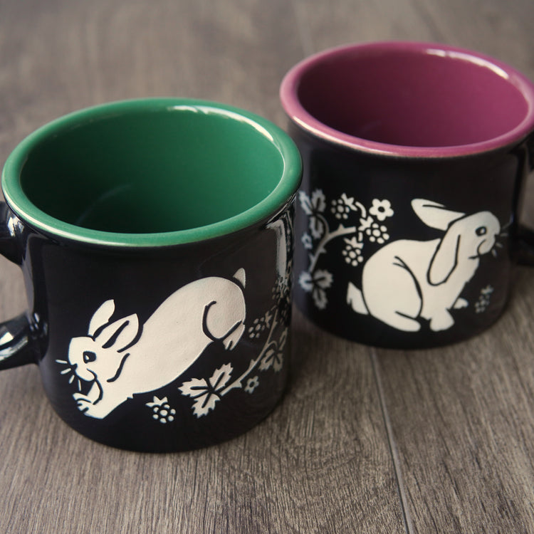 Get cozy while sipping your favorite hot beverage with our Rabbits mug. This two-tone colored USA-made mug is shiny black on the outside, with your choice of color on the inside. It features a hopping rabbit and lop-eared bunny, frolicking through blackberry brambles. This cute design is sandblasted through the glaze layer on both the front and back. The perfect gift for Easter, or for a rabbit lover!
