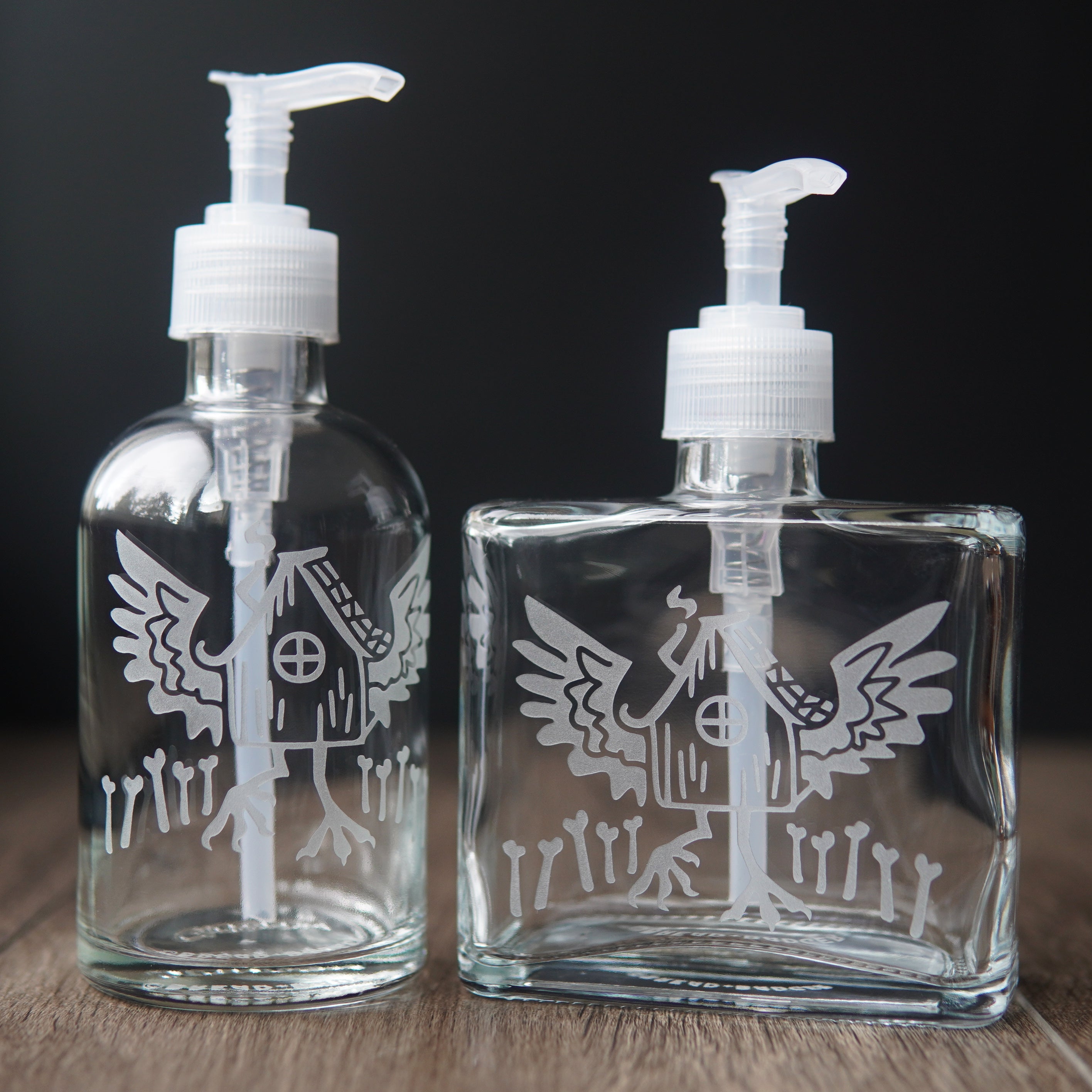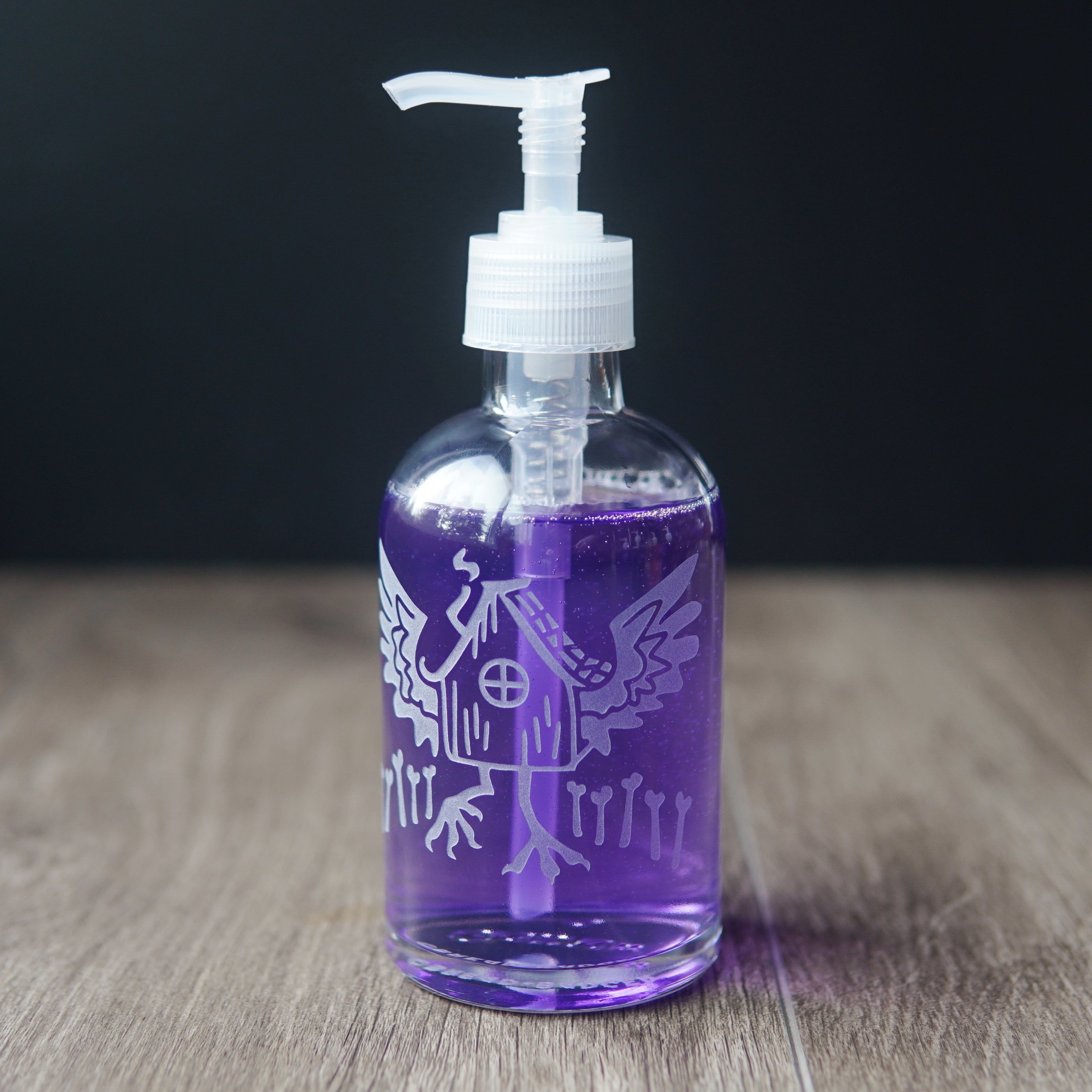 Our etched pump bottles bring sustainable style to your kitchen or bathroom. They look best filled with colored dish soap, hand soap, or moisturizing oils. Lotions work great too, but my etched designs won't show up as well over white. Not recommended for solvents, as they may deteriorate pumps and cause clogs or leaks.