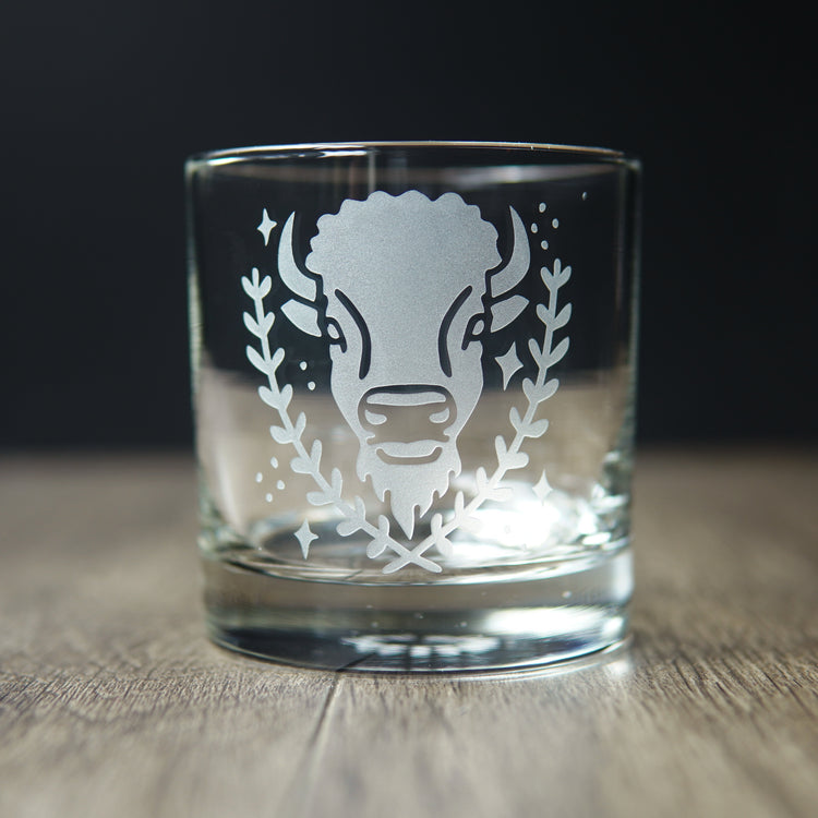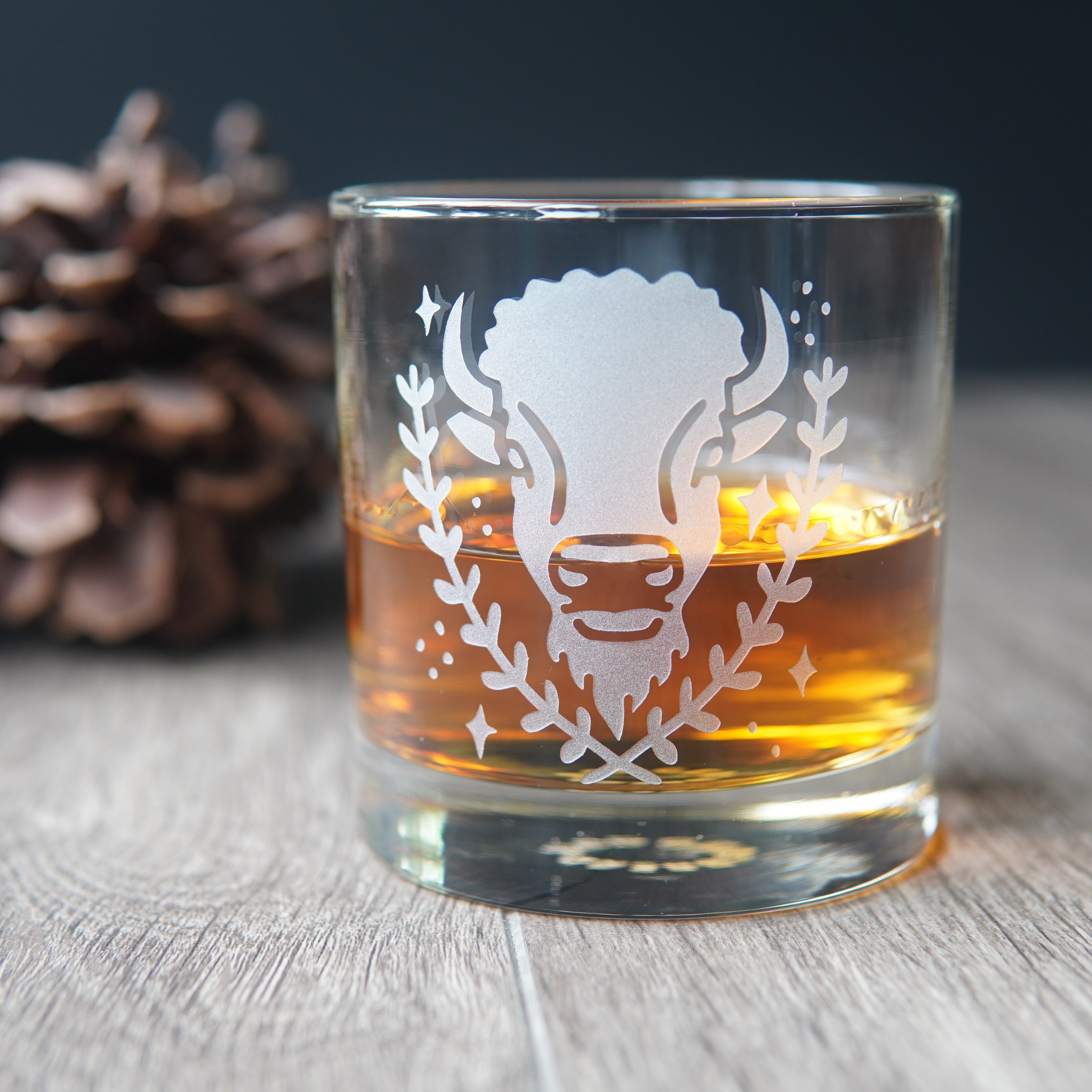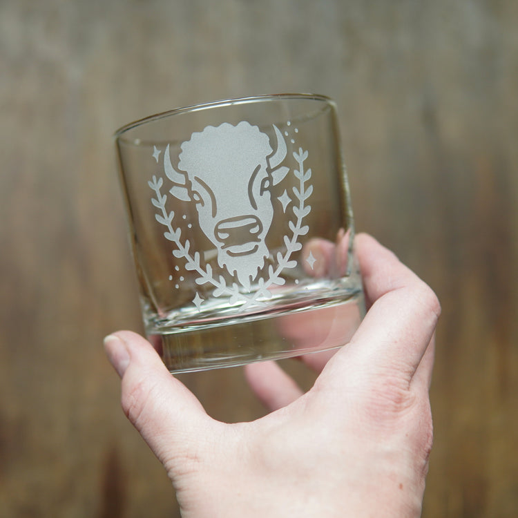 Celebrate America's national mammal with our Bison lowball glass! This etched glassware features our bison design symbolizing strength, bravery, and unity. Perfect for any lover of buffalo wings or fluffy cows, this glass will remind you of the natural beauty of our wildlife (and their adorable noses!).