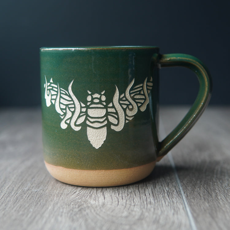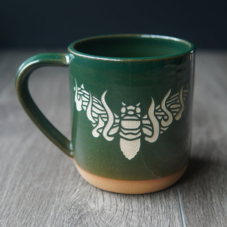 These rustic farmhouse-style mugs are lovingly wheel thrown by a small pottery studio before I sandcarve my original graphics through the glaze from my home studio in Portland, OR. The design has crisp edges, and is deeply carved to expose the bare stoneware.