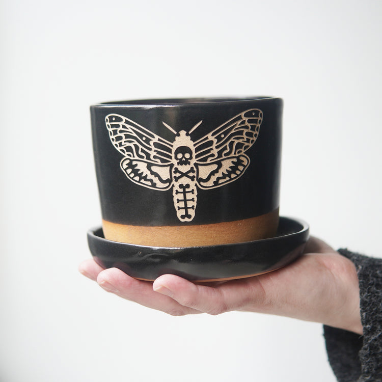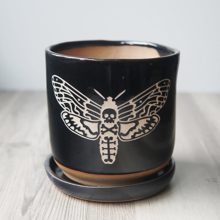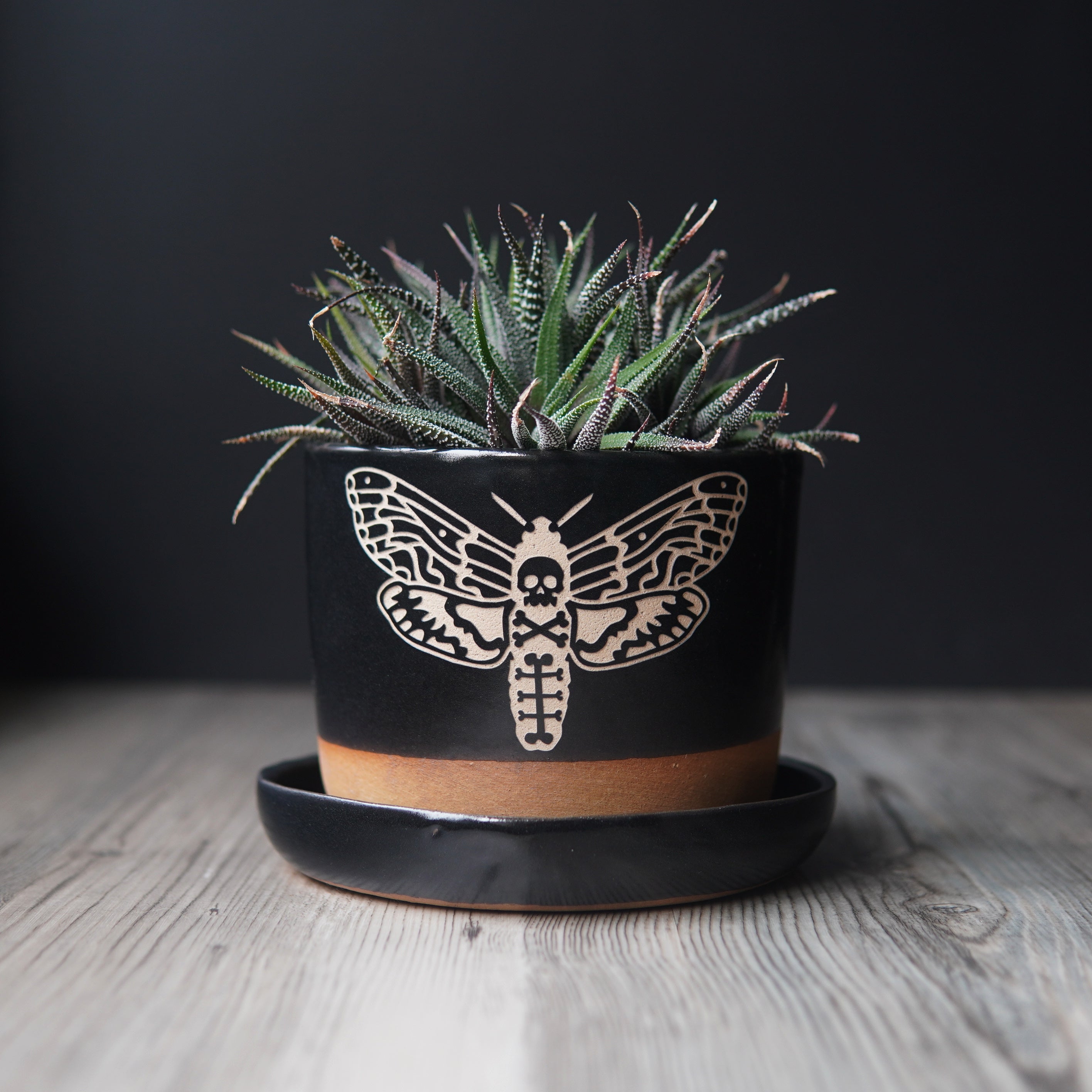This bold Deaths Head Hawkmoth is sure to add a spooky twist to your plant collection. This gothic memento is perfect for adding a touch of dark forestcore vibes to your home.