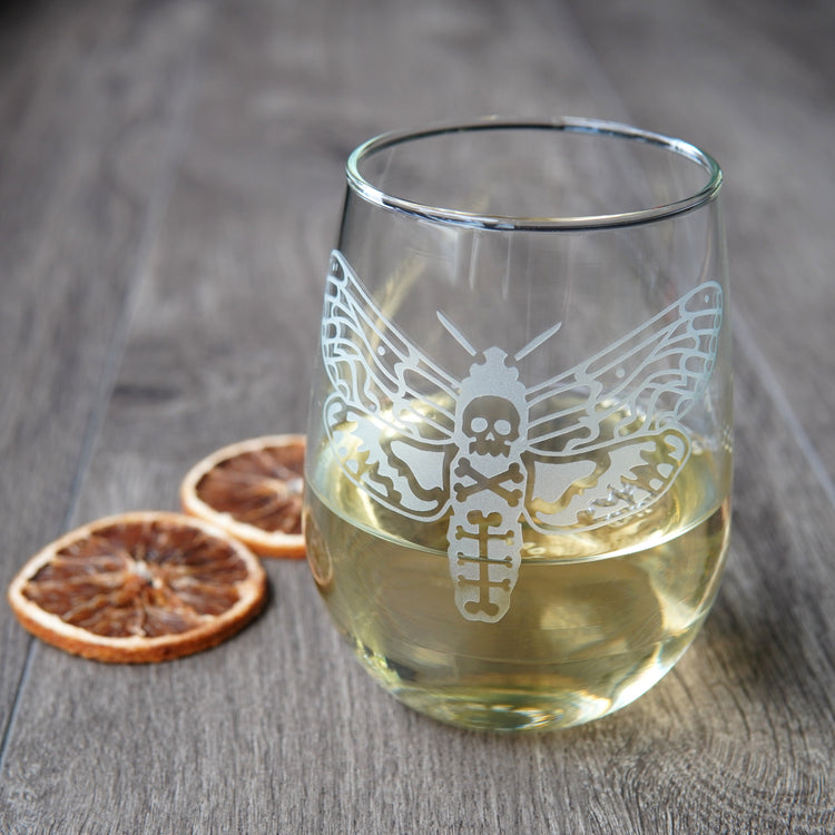 These deaths head hawkmoth etched stemless wine glasses bring spooky vibes to your favorite beverage. These skull and bones moths will keep bringing spooky autumn vibes all year, or just for the fall. These engraved creepy critters will never fade or wear away.