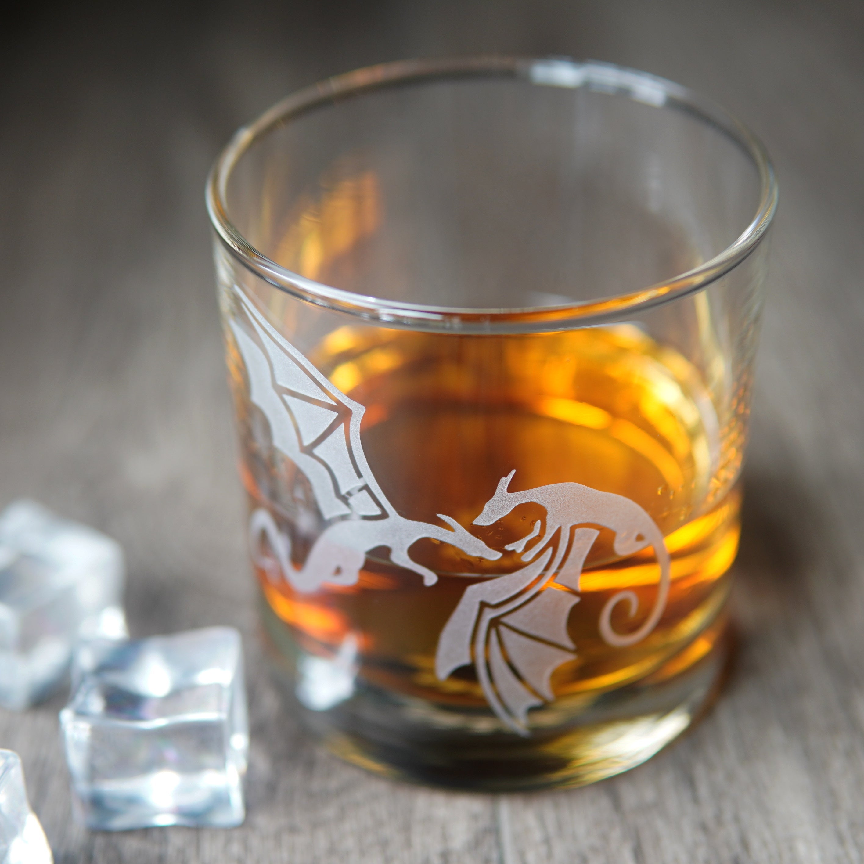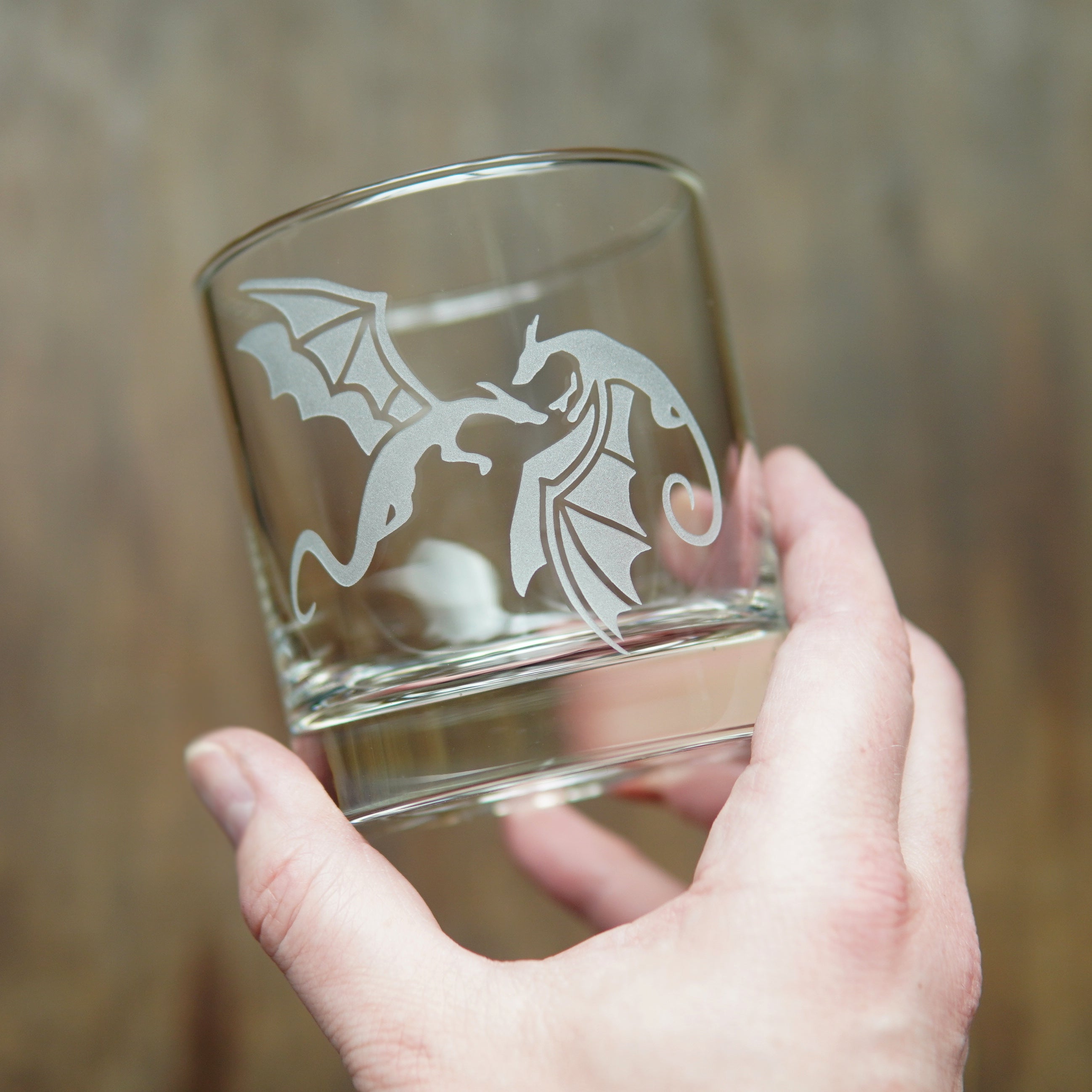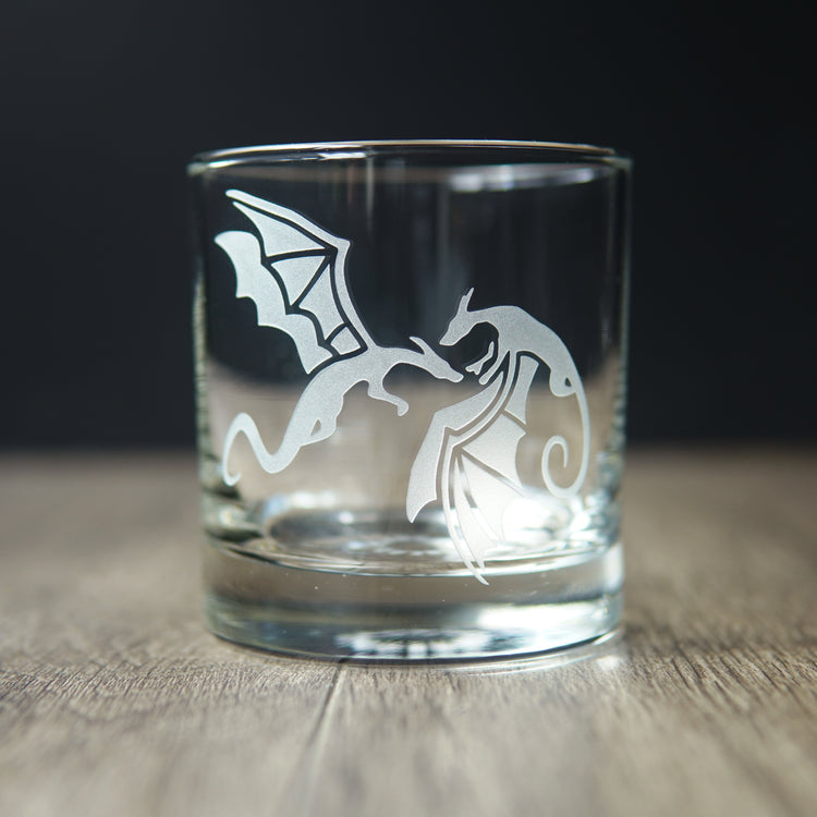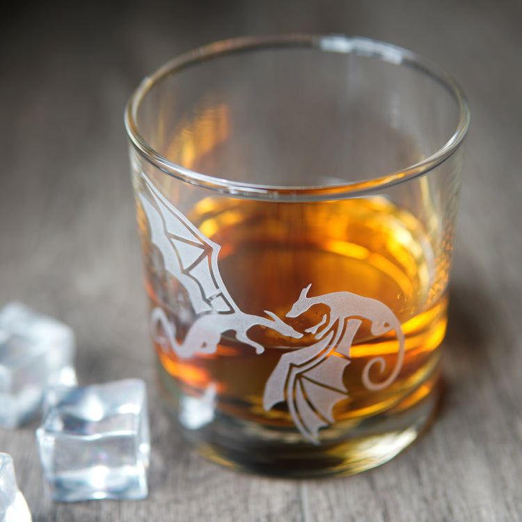 Summon some magic with our Dragon lowball glass! This etched barware featuring a pair of flying dragons makes a perfect gift for fantasy romance fans and medieval gamers alike.