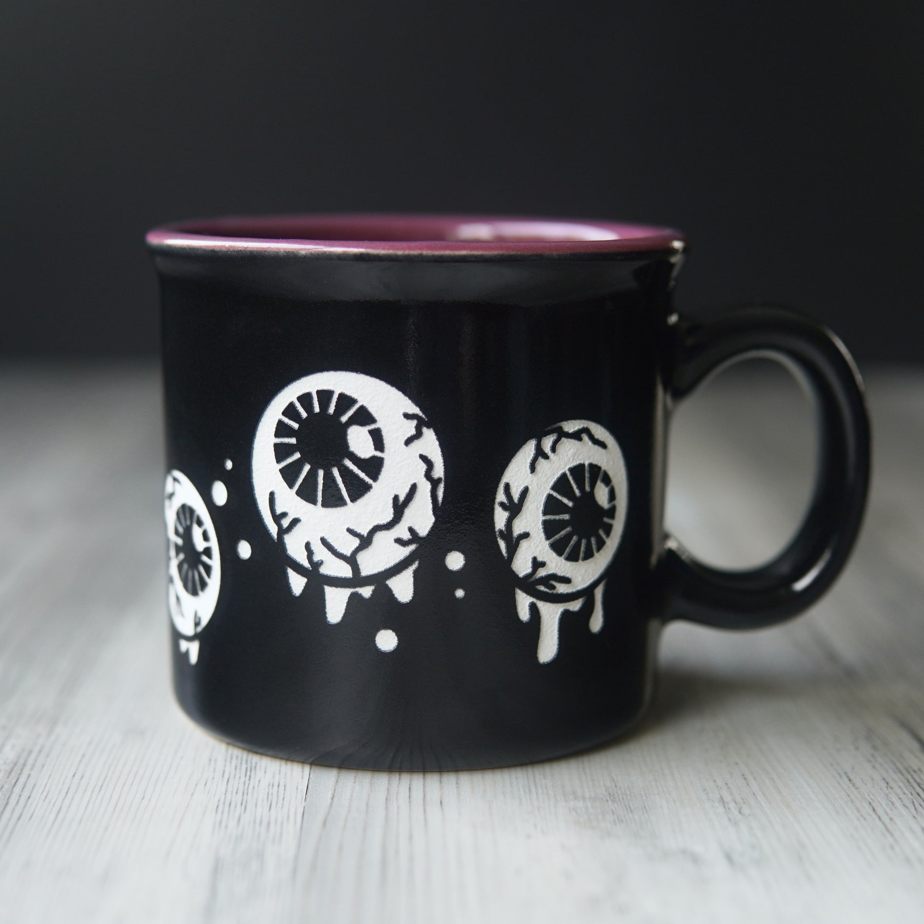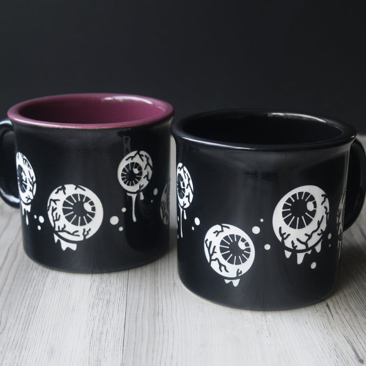 Elevate your senses with our Eyeballs Mug: ceramic engraved with dripping, floating eyeballs with creepy veins, wrapping all the way around. This two-tone colored USA-made mug is shiny black on the outside, with your choice of color on the inside. Perfect for Halloween, horror lovers, and goth kitchens.