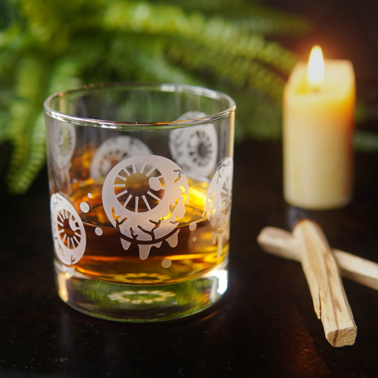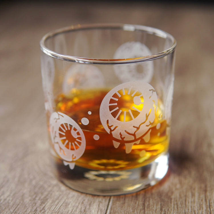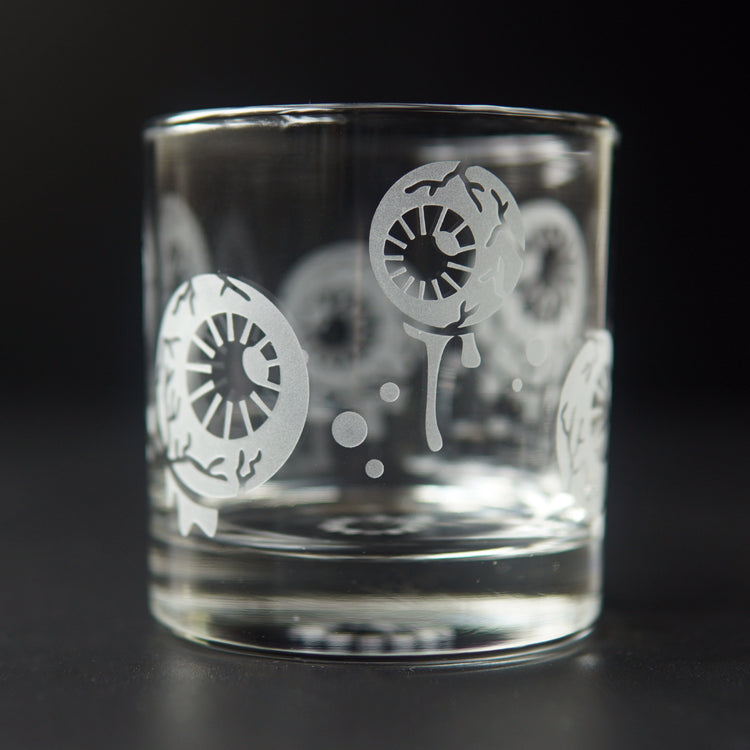Indulge your senses with our Eyeballs lowball glass: barware engraved with dripping, floating eyeballs with creepy veins, wrapping all the way around. Perfect for Halloween, gory horror lovers, and goth kitchens. Elevate your beverage routine with this eerie monster etched glassware.