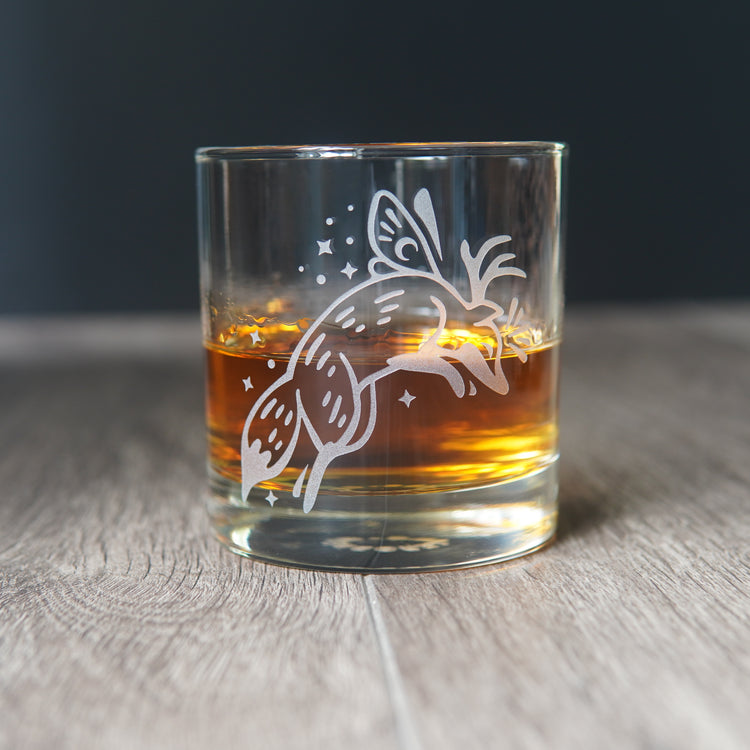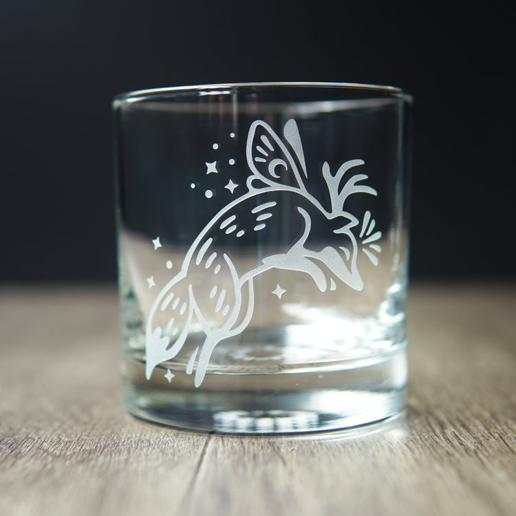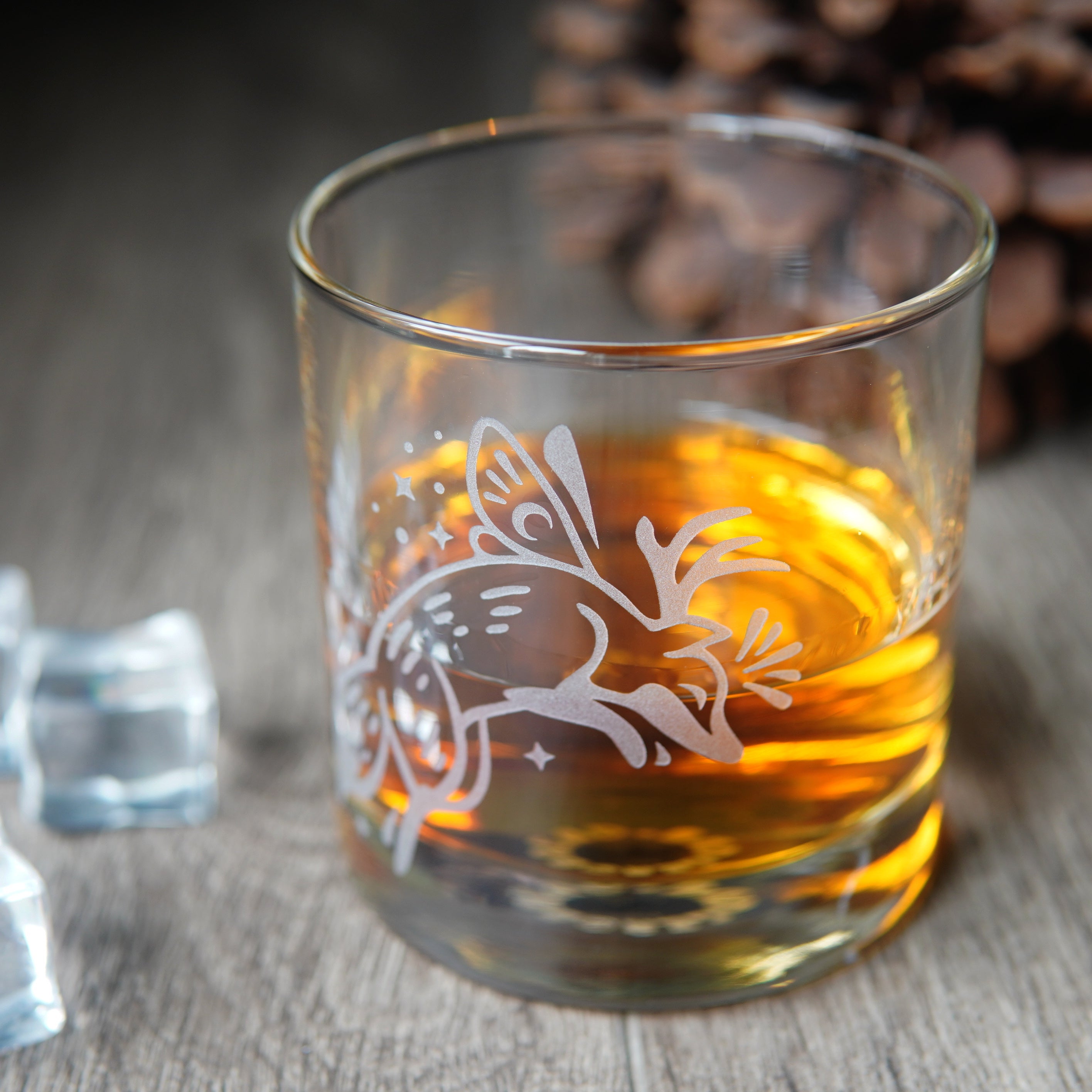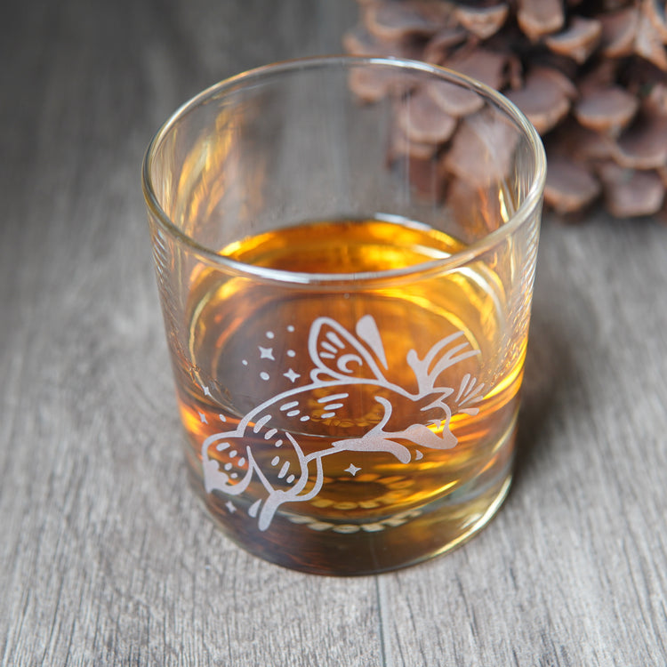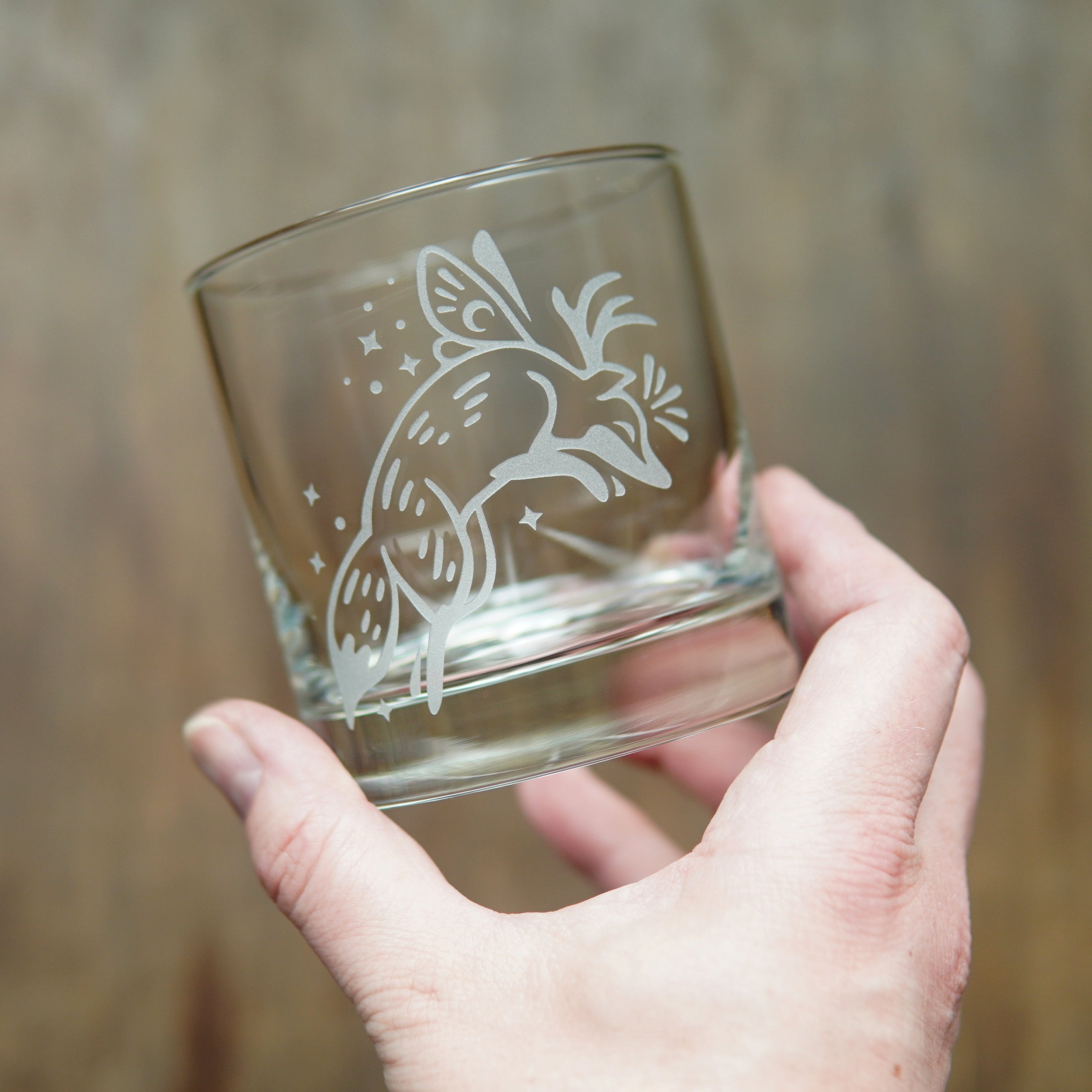 Do you believe in magic? Our Fox Fairy lowball glass is for you! This etched glassware features a whimsical leaping fox with antlers and faerie wings. This playful design will remind you to watch out for trickster fae creatures, while adding a touch of enchantment to your drinks. Fox symbolizes cleverness and good luck in many folk tales and mythology.