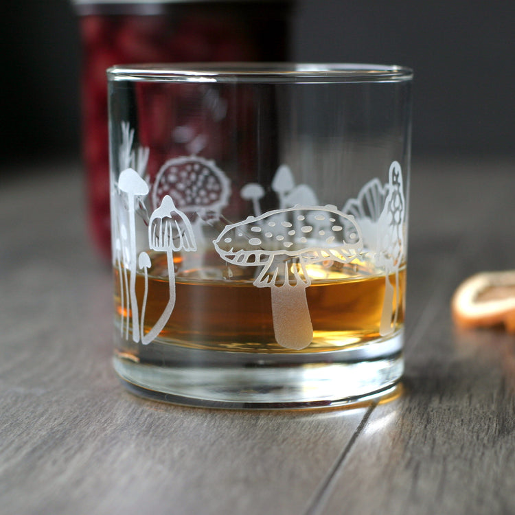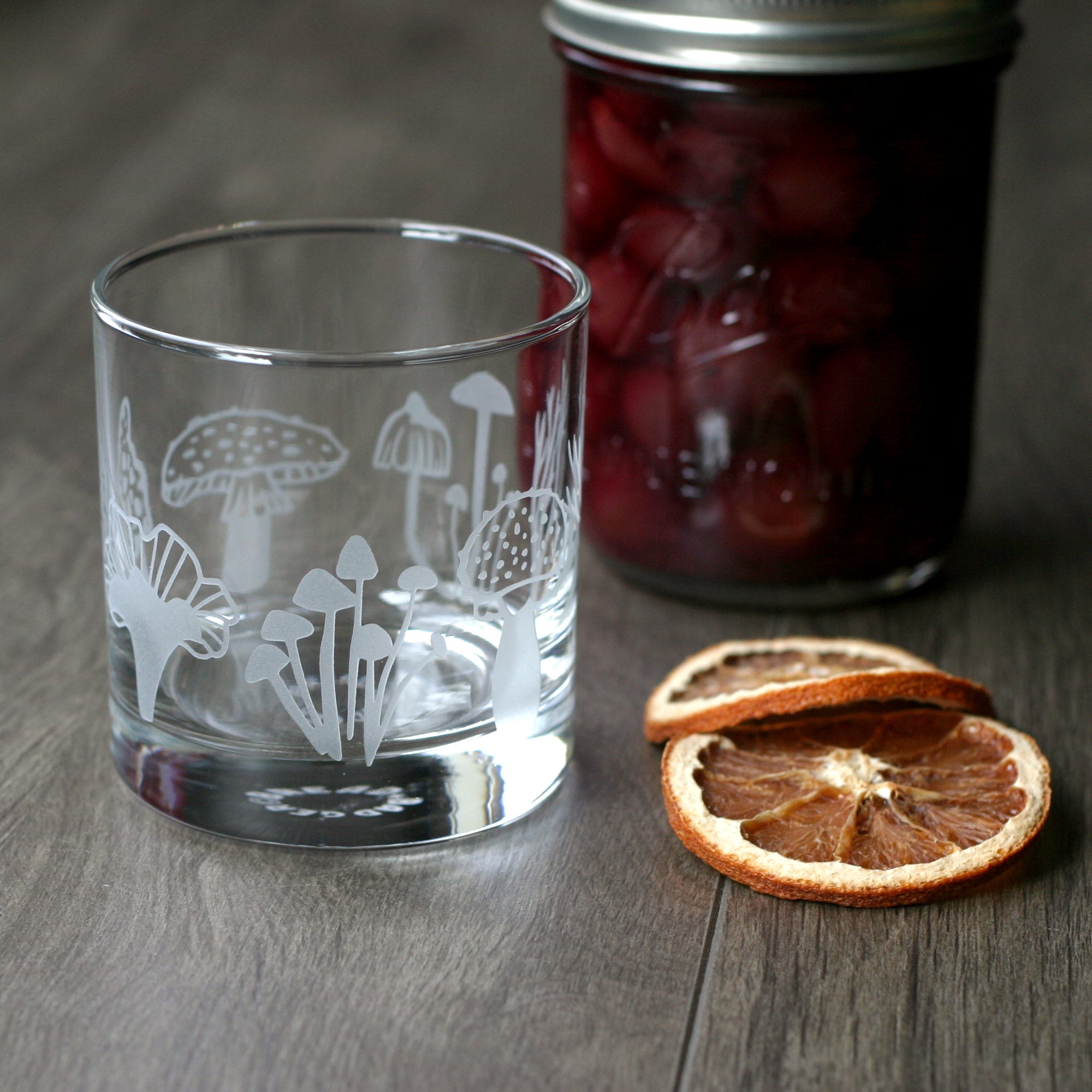 Are you an intrepid mushroom forager, out on the prowl for the next hidden trove of delicious morels? The mysterious and marvelous 'shroom kingdom of the forest awaits! Indulge your passion with our chic engraved lowball glasses, featuring charming illustrations of edible mushrooms and forbidden fungi!