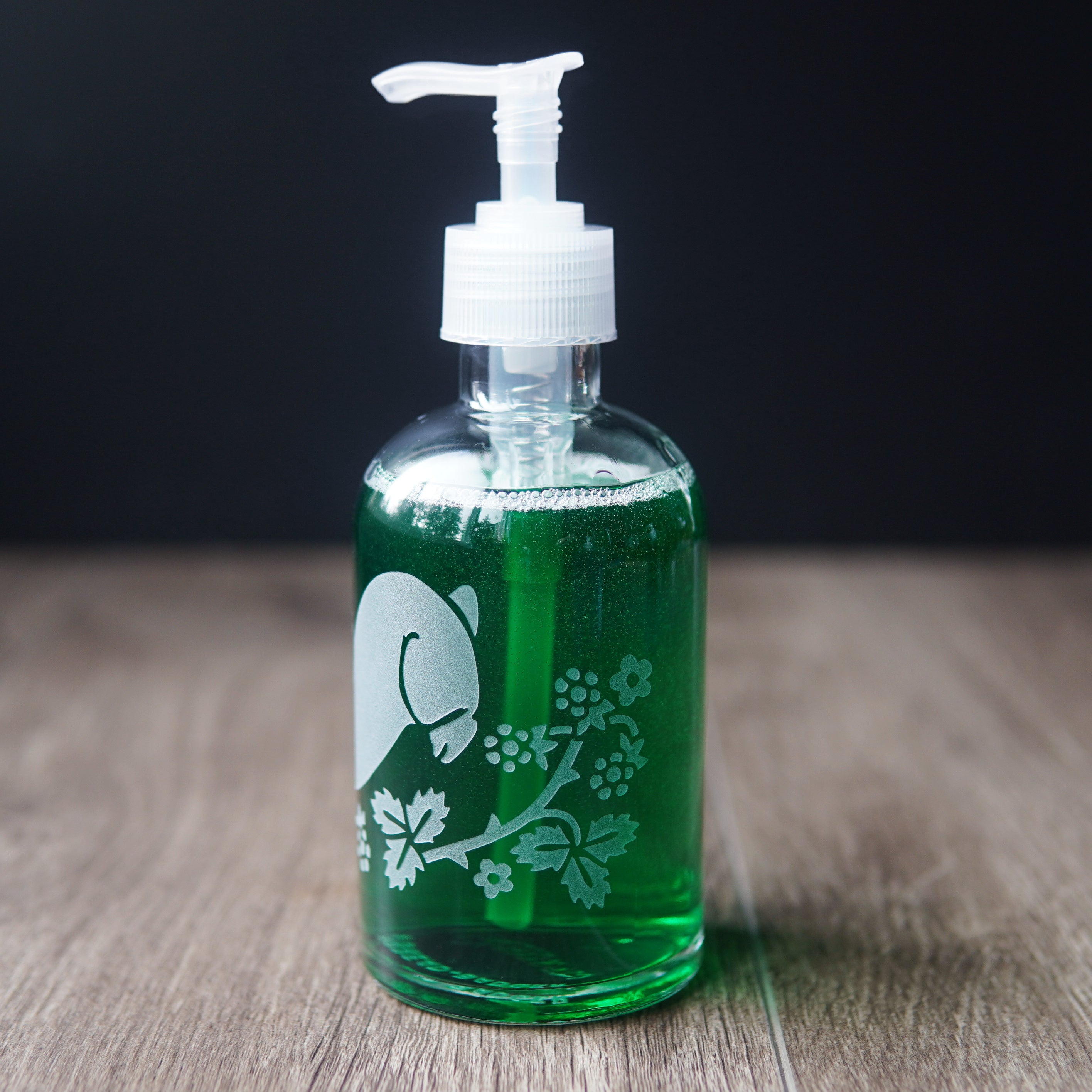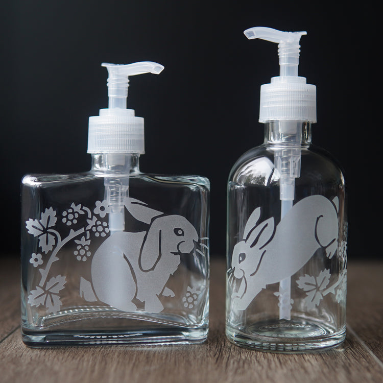 Our etched pump bottles bring sustainable style to your kitchen or bathroom. They look best filled with colored dish soap, hand soap, or moisturizing oils. Lotions work great too, but my etched designs won't show up as well over white. Not recommended for solvents, as they may deteriorate pumps and cause clogs or leaks.