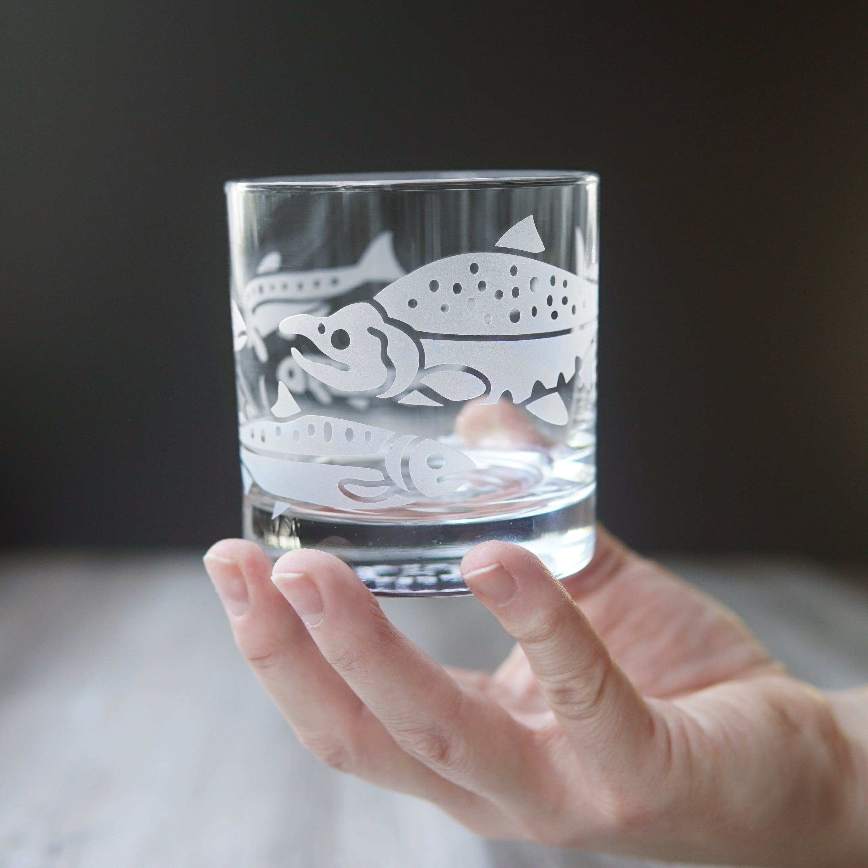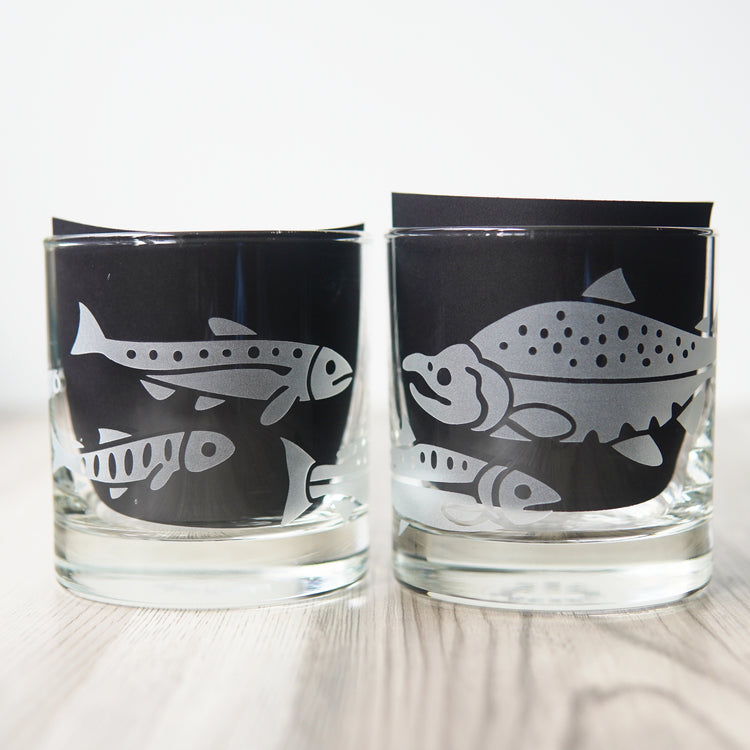 Treat yourself to these salmon-etched lowball glasses - it's the perfect way to add a touch of class and sass to your favorite drink (whether it be whiskey, wine or just plain H2O). Perfect for folks who like to fish, especially dads and grandpas. The wraparound design shows salmon in different stages of development, with a full-grown sockeye salmon swimming back upstream to spawn.