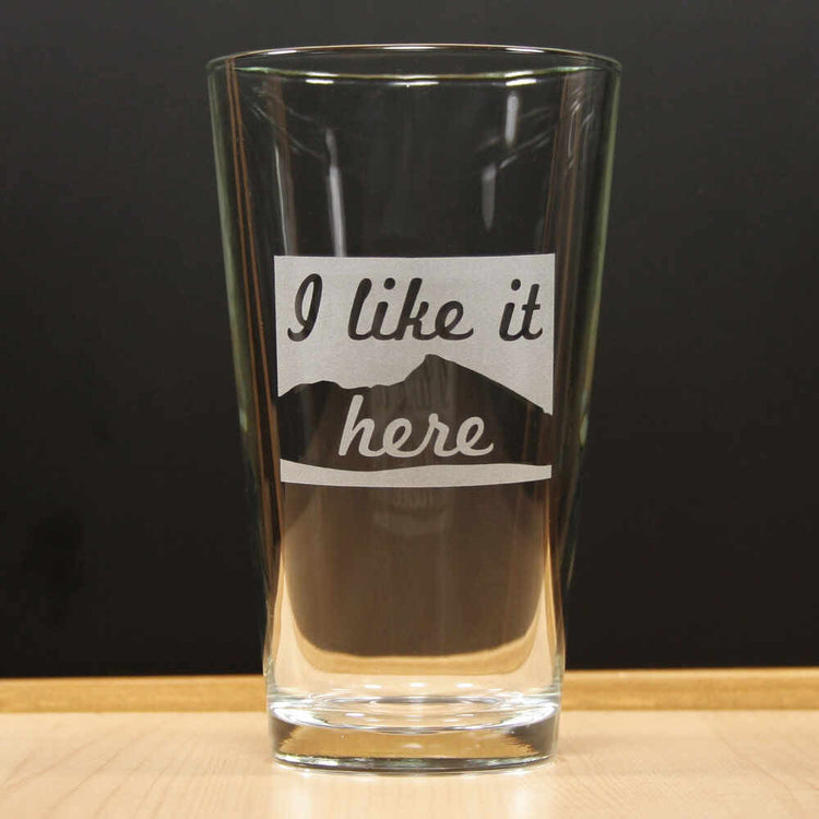 I like it here! Show your home state pride with this custom etched pint glass in your favorite state outline. Ask to see any state!