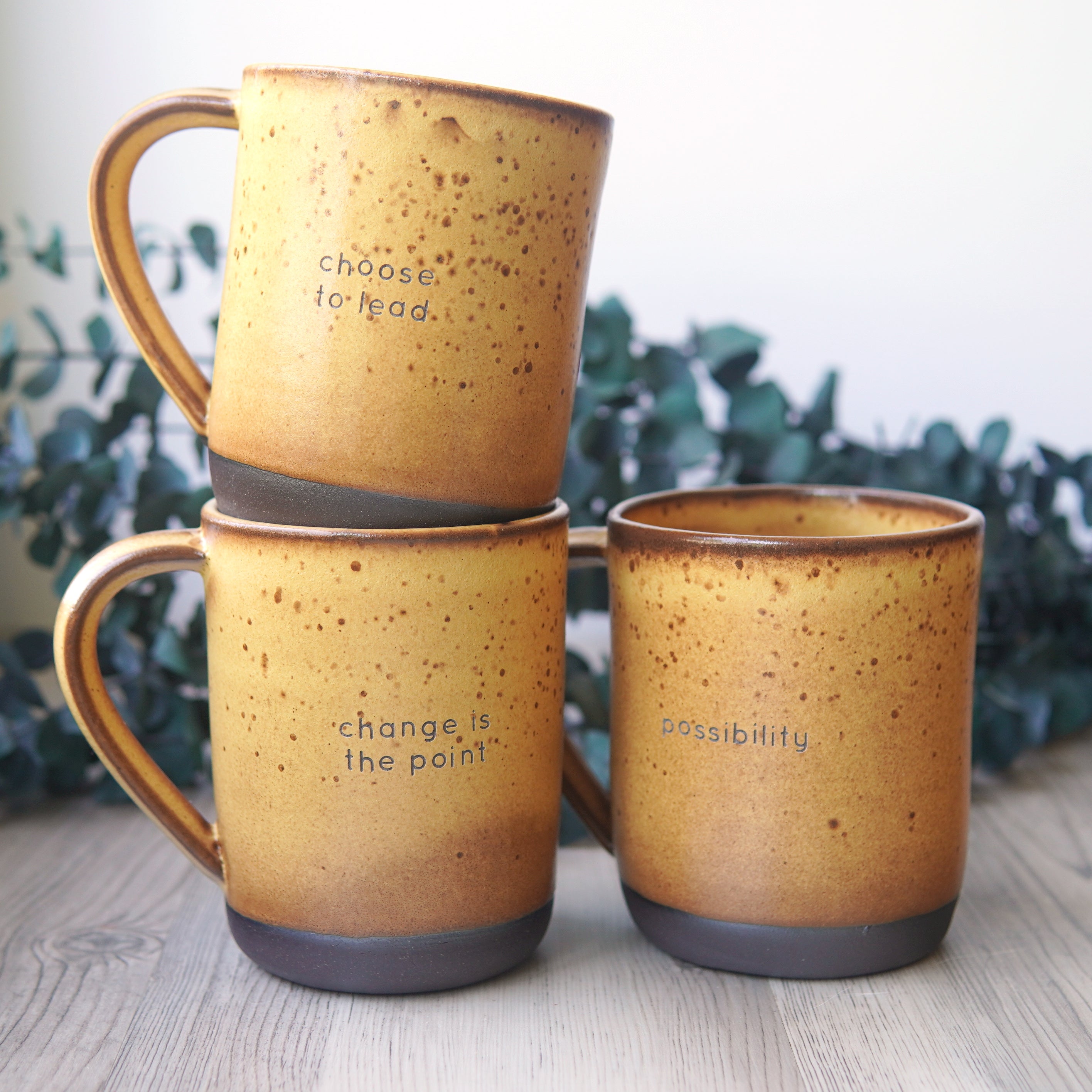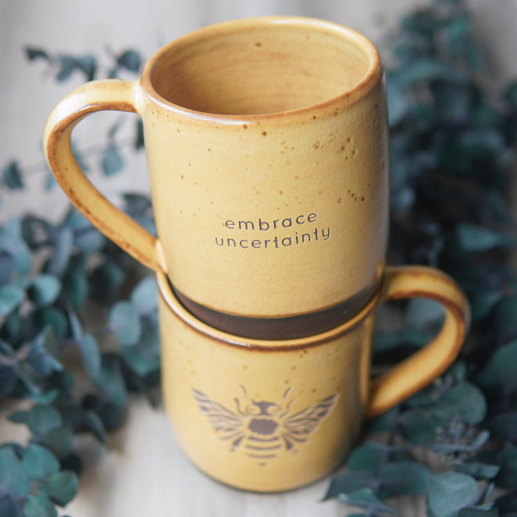 In the spirit of embracing uncertainty, the phrase on the back of your mug will be a surprise. Our classic honey bee design is engraved on the front when held in the right hand, and one of 6 phrases will be on the back: