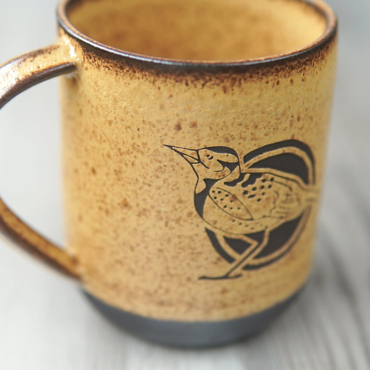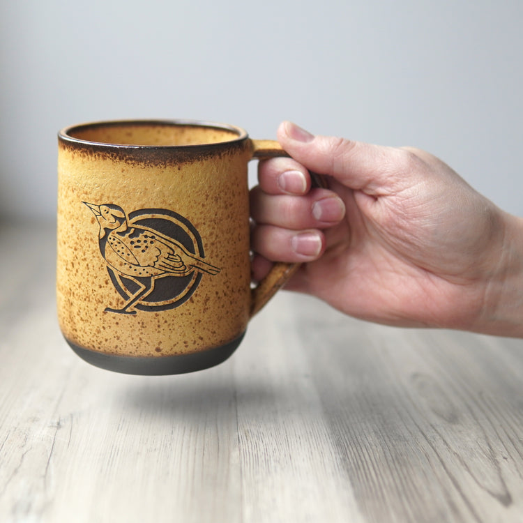 Western Meadowlarks are beautiful yellow birds with long, thin beaks. This meadowlark mug makes a bright, cheery gift for bird lovers. The western meadowlark is the state bird of Oregon, Wyoming, Montana, Kansas, Nebraska, and North Dakota.