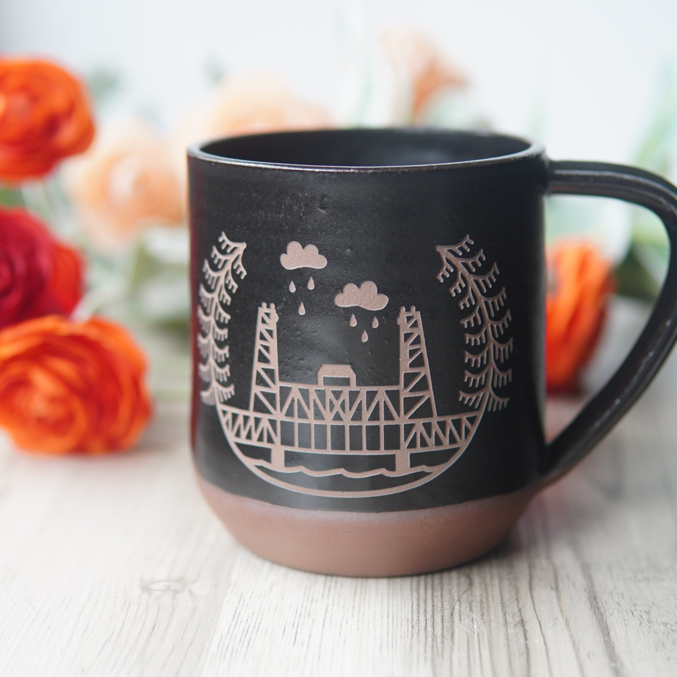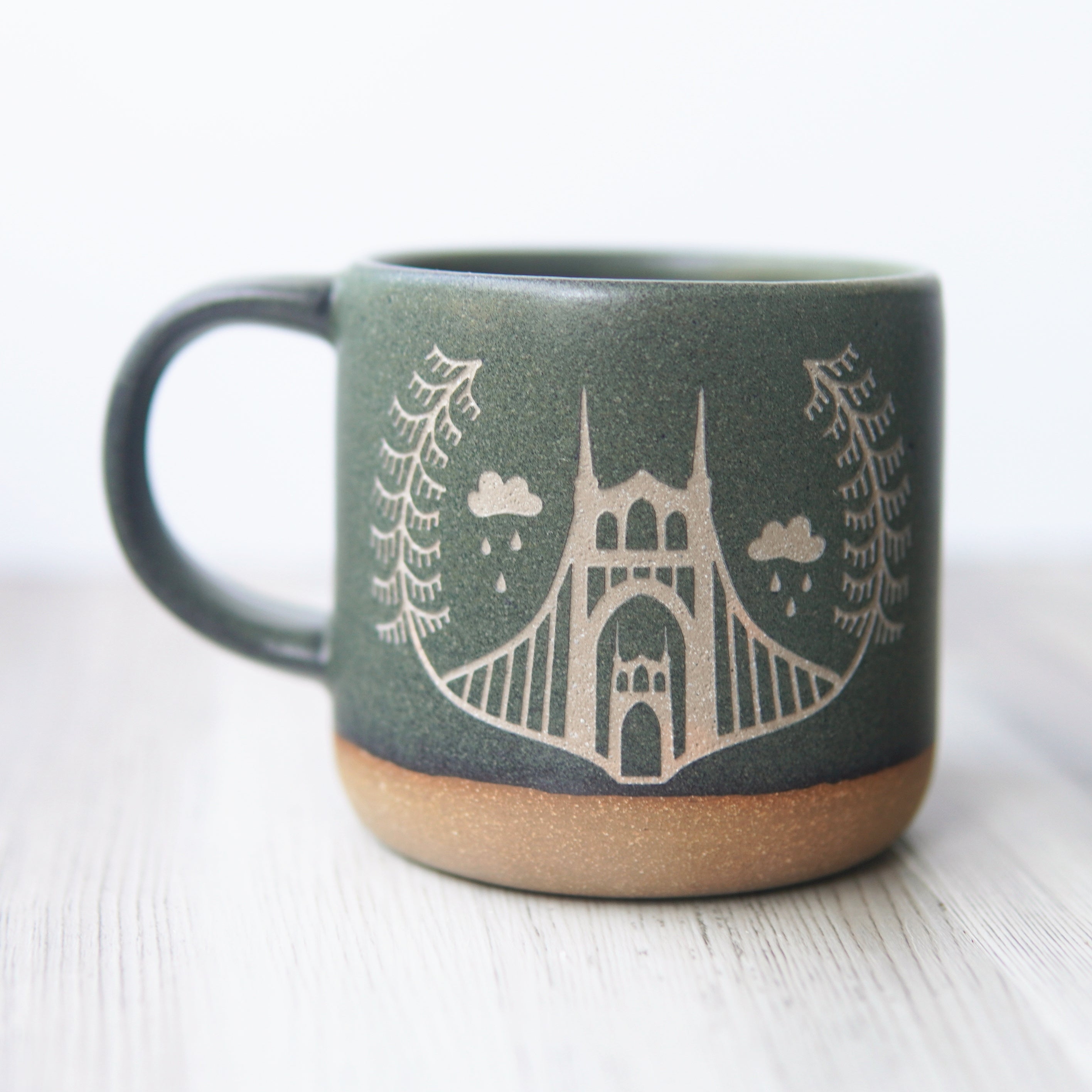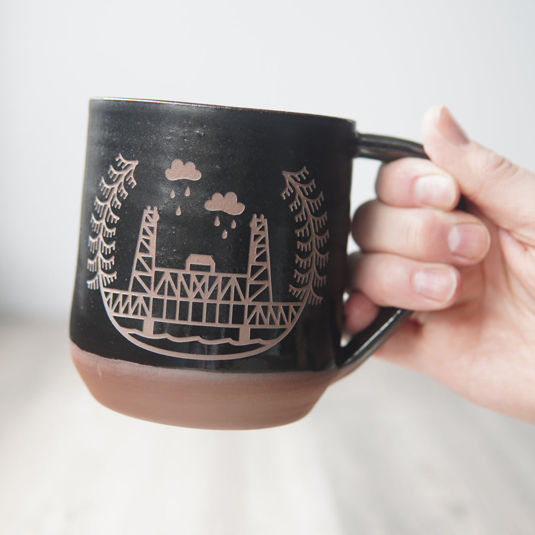 Designs feature Portland Bridges, Rabbits, a Capybara Cat, an Owl Cat, a Dragon, a Phoenix, a Wolf, and a Raccoon. New ceramic styles include the Introvert line of locally handmade speckled mugs and tumblers.