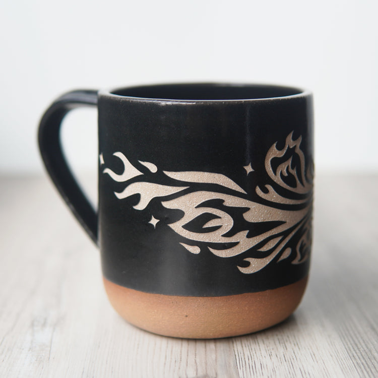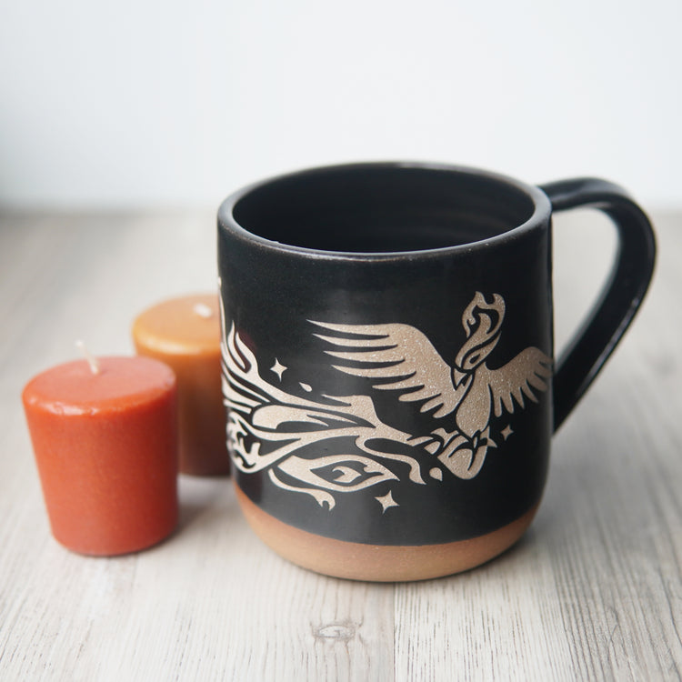 The engraved design on this handmade pottery mug is inspired by the mythical flaming phoenix, a legendary bird known for its fiery rebirth from the ashes. This ancient symbol of renewal and resurrection adds a unique and inspiring touch to your daily cup of coffee or tea routine.