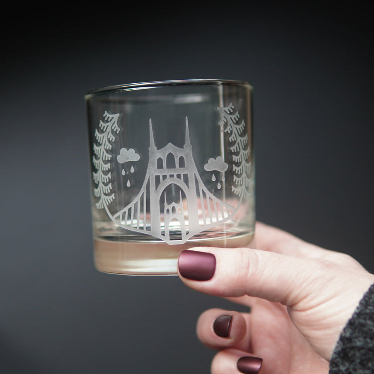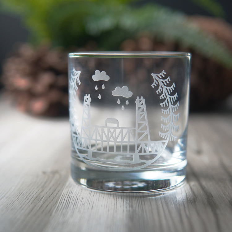 Portland, renowned as "Bridgetown," has two beloved bridges: St. Johns Bridge, a green icon, and the Steel Bridge. To salute these local landmarks, we designed stylized depictions of them, surrounded by garlands of fir trees with rain clouds in the sky.