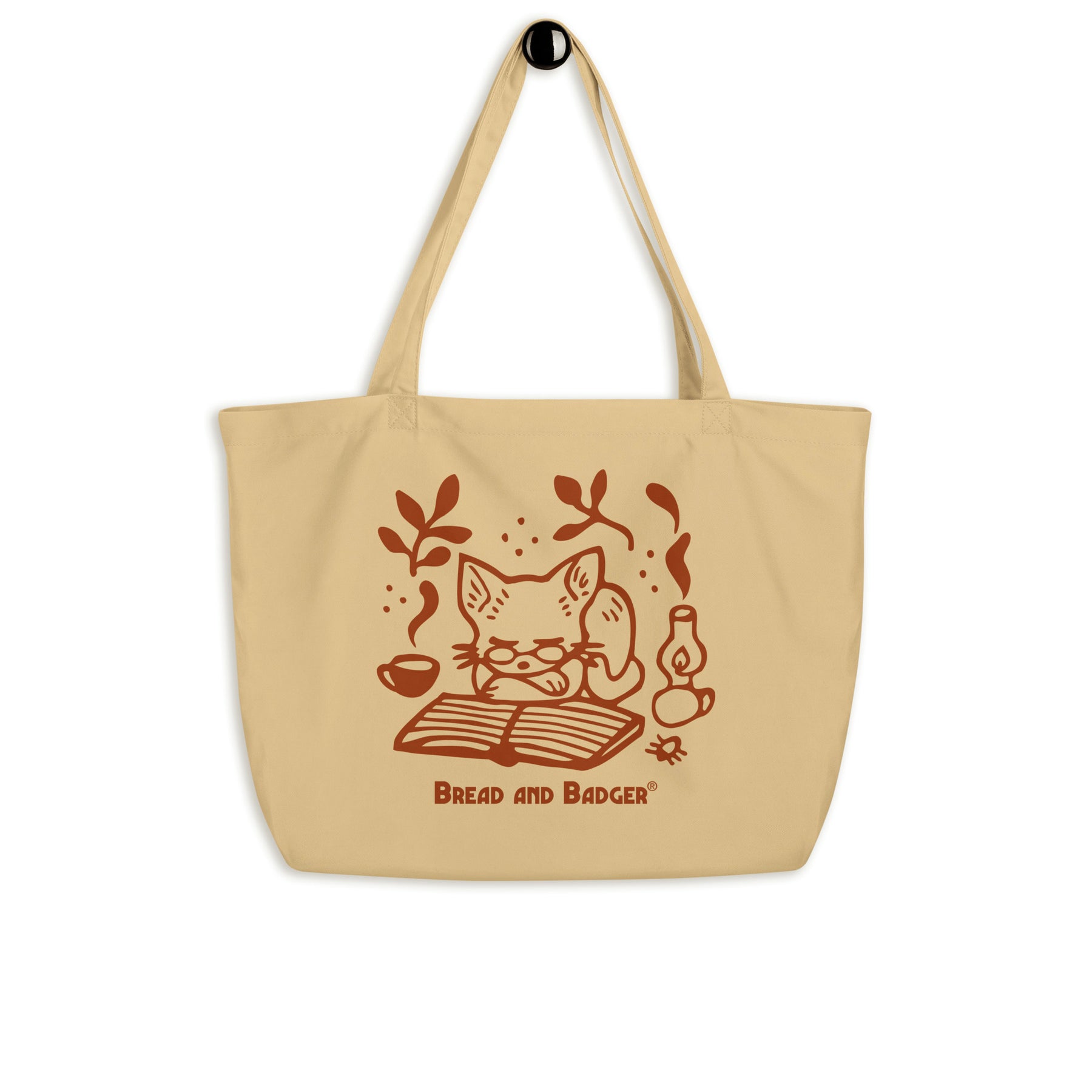 Our Book Cat grocery tote bag is the purr-fect gift for your bookish friend! Featuring a cozy, cute cat snoozing on an open book next to a steaming mug and flickering oil lamp.