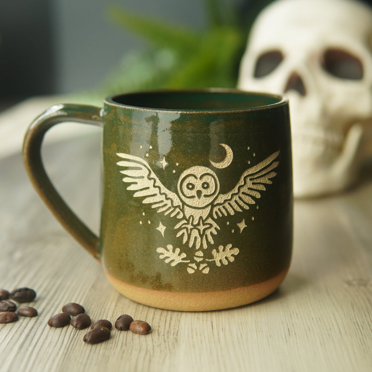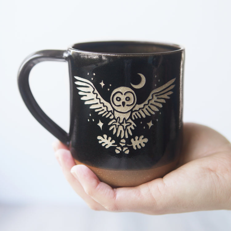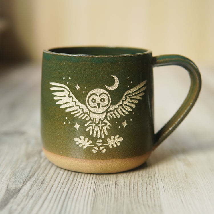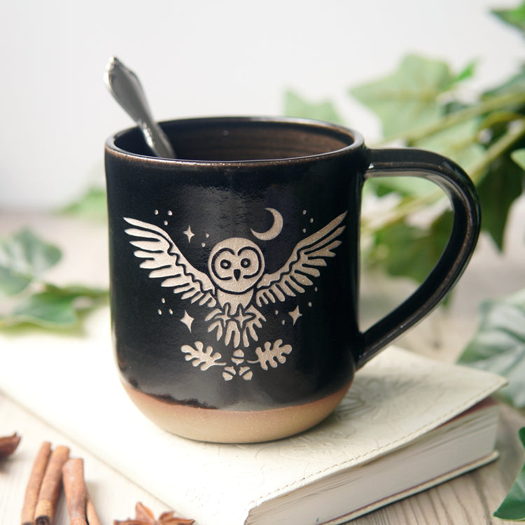Sip your morning brew in style with this handmade Owl + Oak mug! With a great grey owl swooping over oak leaves and acorns in a starry night sky, this farmhouse-style mug adds a unique rustic touch to your coffee ritual. This outdoorsy mug is the perfect vessel to help you celebrate your inner wisdom and bring the transformation you seek.