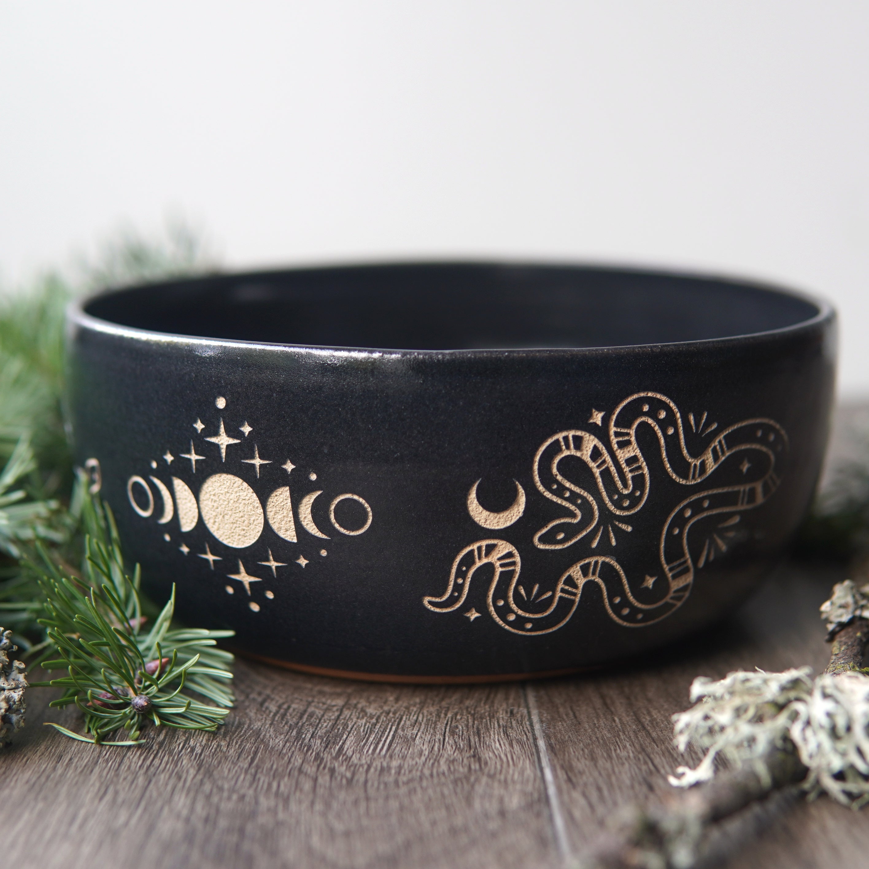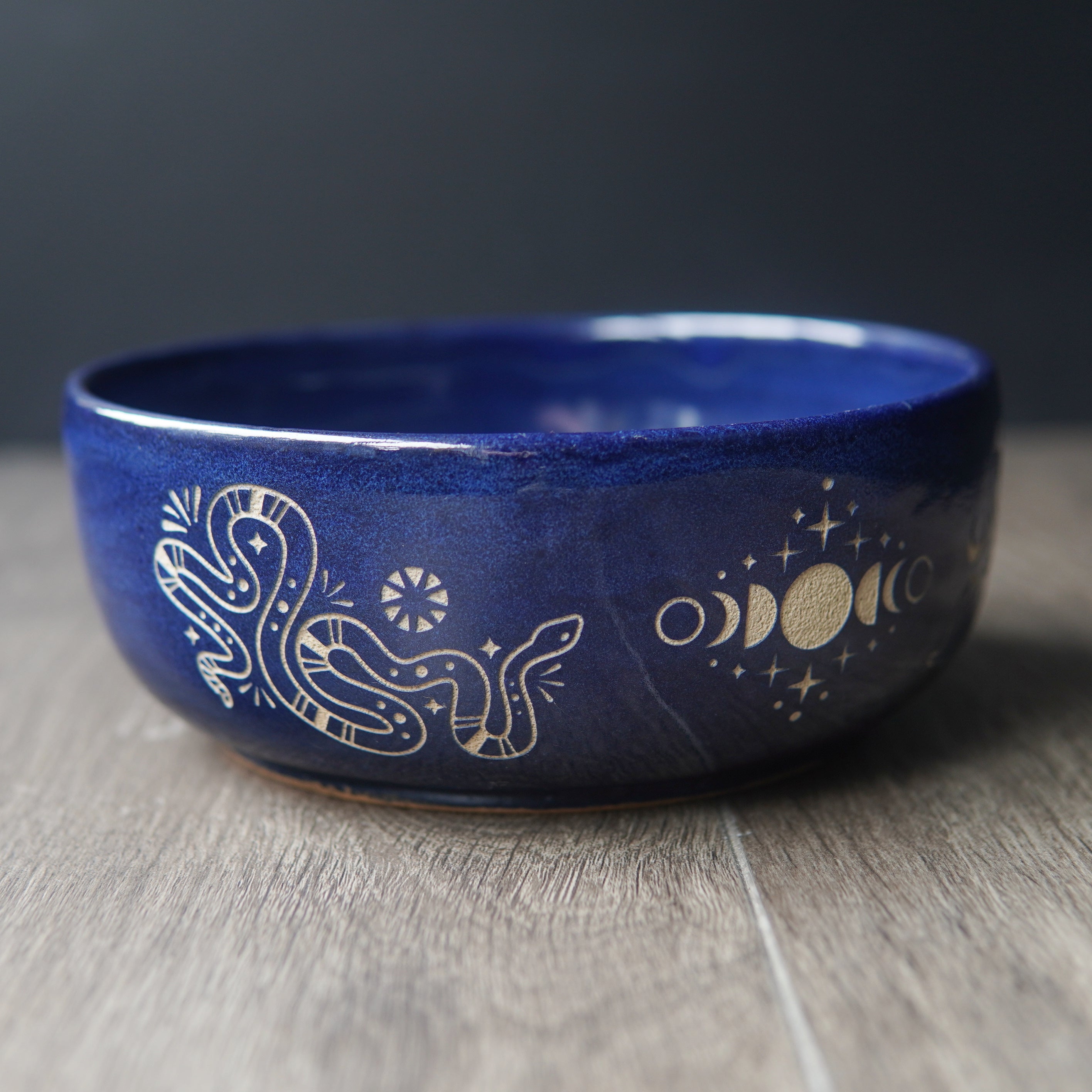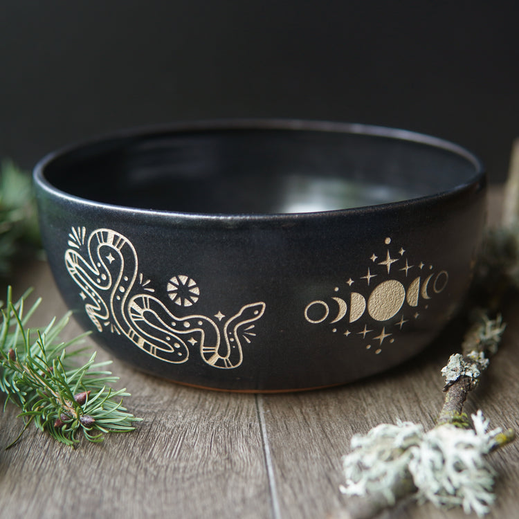 These rustic dinnerware bowls are lovingly wheel thrown by a small pottery studio before I sandcarve my original graphics through the glaze from my home studio in Portland, OR. The design has crisp edges, and is deeply carved to expose the bare stoneware.